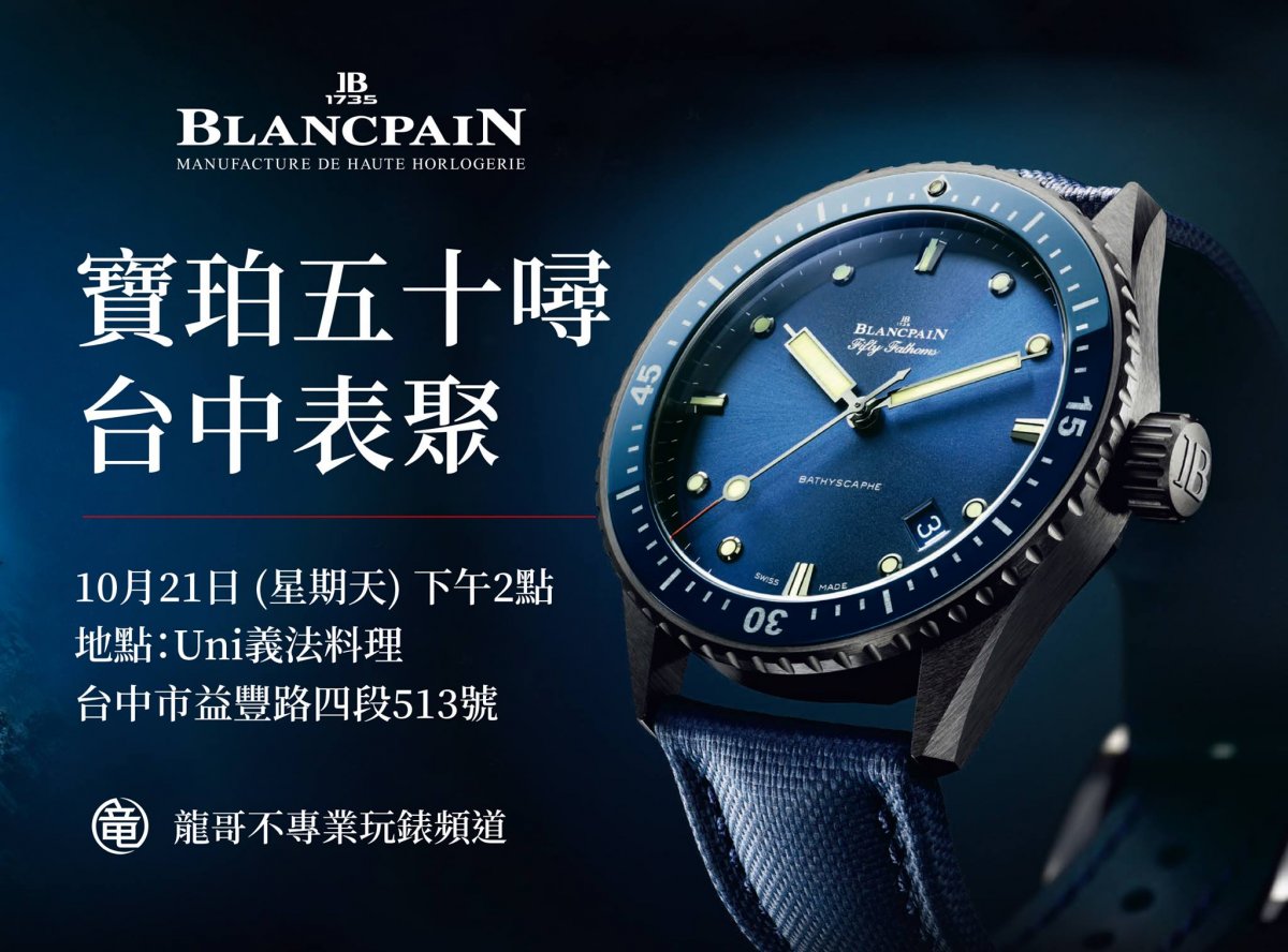 錶界社團當紅炸子雞「龍哥」號昭龍團力挺寶珀錶BLANCPAIN相會台中錶聚。在台中舉辦這場難得的假日午後錶聚,現場不但有精緻的餐點外,還可以近距離的欣賞各式50噚及寶珀美錶,順便聽聽哥跟大家聊聊寶珀錶BLANCPAIN五十噚的歷史故事。