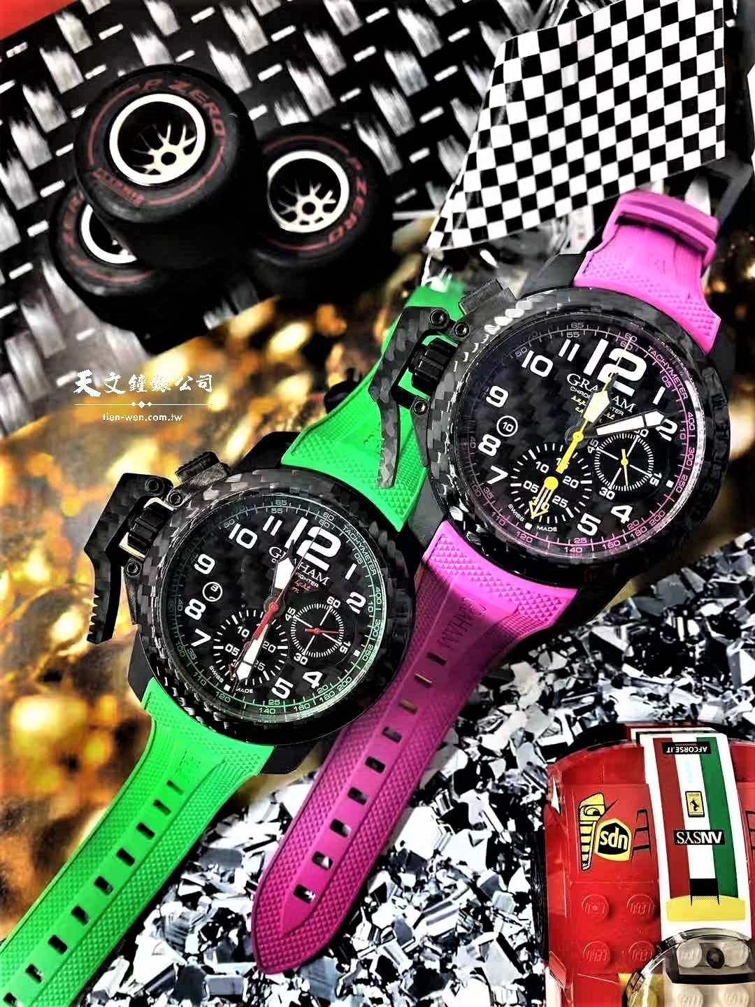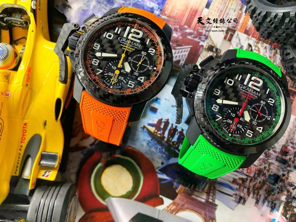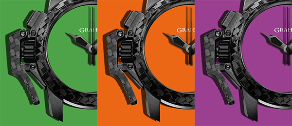 格林漢Graham與賽車的淵源絕非表面功夫。自2009至2011持續贊助布朗GP一級方程式車隊(Brawn GP Formula One),接而贊助Swiss Porsche Cup、Isle of Man Tourist Trophy、Baja 1000、GT Asia系列、Spengler Cup Silverstone circuit 、Swiss Gurnigel Hill、Club Porsche Romand等賽事。將碳這當代賽車輕盈敏銳特質的關鍵,結合吸睛的輪胎色系,精確地反映出這些錶款完美結合外觀與機能的平衡美。而與輪胎有所不同之處是,錶帶的功能不受氣候影響,橡膠成份非常穩定。無庸置疑的是,這些錶款絕對不適合軟弱的心。橙色代表期盼,綠色代表行動,紫色則可謂新世代的紅色,絕對自信滿滿。配上「巴黎釘紋」圖案,這些大膽、時髦的造型就如賽車般萬眾矚目。 每一枚重量不超過100公克的這些運動錶款,速度也絕不慢下。錶殼、樞紐、錶圈、錶盤、釦環都是以高科技輕質碳所製成,這素材已經是F1賽車結構在二十一世紀的重要素材。運用它所製成的腕錶,輕盈到幾乎無感,只是獨特的設計和經典的觸發樞紐讓人難以忘懷。