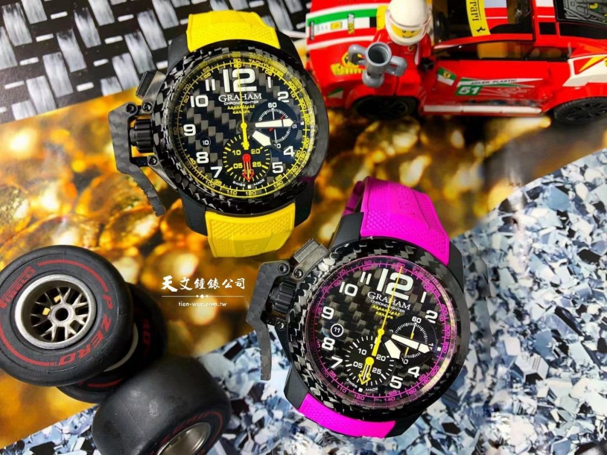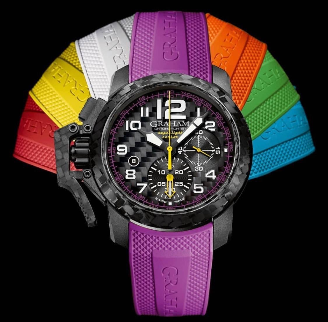 格林漢GRAHAM全新Chronofighter Superlight Carbon腕錶將F1一級方程式賽車輪胎的鮮豔色彩整合入腕錶的設計。這個血液中噴張著賽車燃料油、腦內充斥著大膽的設計風格的品牌,推出全新的腕錶款,將超輕盈的高科技碳結合超動感的造型。