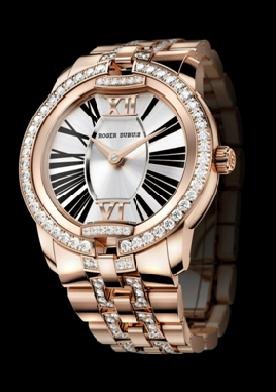 201211-01 Roger Dubuis羅傑杜彼 Velvet系列18K金鍊帶鑽錶 Velvet 自動上鏈腕錶 - 珠寶系列 腕錶的每個細節皆彰顯日內瓦高級製錶一絲不苟的精神,數字和鑲塊在錶殼上熠熠生輝,錶殼形狀介於圓形和桶型之間,帶給視覺前所未見的獨特美感。重達2.98克拉的262枚美鑽和金質錶環與錶帶互相輝映,散發晶瑩剔透的迷人光芒。 特色: 銀色錶盤;中央磨砂裝飾;黑色「ROGER DUBUIS」轉印字樣;外層緞面太陽紋;黑色轉印羅馬數字;玫瑰金帶狀裝飾;6點鐘及12點鐘位置設玫瑰金羅馬數字鑲塊;48小時動力儲存 *另有18K白金 分享到: