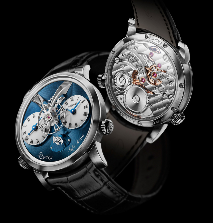 Legacy Machine NO.1 Xia Hang修改了複雜的動力儲存機制,使得夏航的雕塑人偶能由低動力的垂頭模樣完美轉換至滿鍊時的直挺挺坐姿。製作的過程是先由夏航製作出正常尺寸的雕塑人偶,接著MB&F再將人偶縮小至僅有4毫米(1/8吋)的高度,最後才著手進行活動關節的研發。「Mr. Up」(代表指示著動力充足的狀態)的頭、肩膀、背與前胸,會在他越來越沒有動動的時候藉由一組隱藏鉸鍊做出垂下來的動作,於是Mr. Up便成了Mr. Down。這些極為精細的微機械雕塑以鋁合金製作,好讓運作所需的能量降至最低。精緻完美的拋光打磨,則讓這組小人光彩絢麗、又能捕捉所有人的目光,同時也忠實地遵循著夏航起初的創作概念。