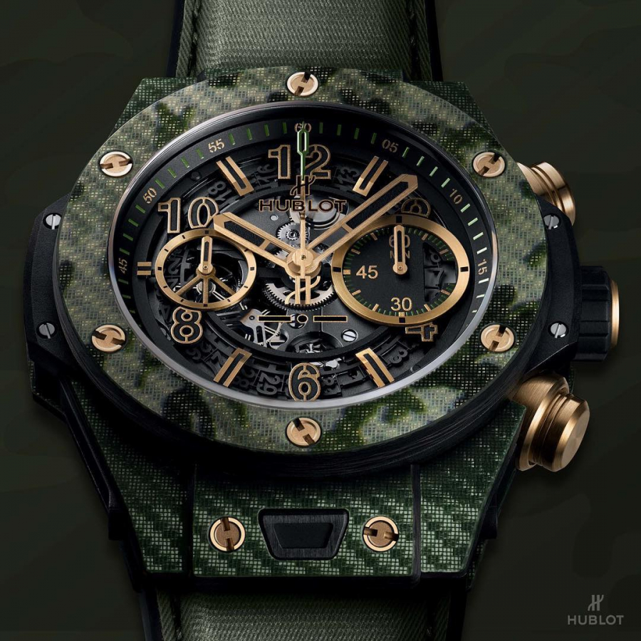 最新Big Bang Unico Italia Independent聯名腕錶,不但具有碳纖維材質優異的輕盈強悍,同時提供 無限的色彩變化。最引人矚目的,則是擁有鍍鋁碳纖維獨特的金屬幻彩效果。腕錶為直徑45mm的 計時碼錶,搭載Hublot宇舶表UNICO自製機芯,並搭配兩條可任意替換的一鍵快拆式錶帶。 其中一條是以充滿古典軍裝風的絲光卡其布料(chino fabric)製作,第二條則是現代軍事裝備中經常使用的SuperFabric®創新材質所製。