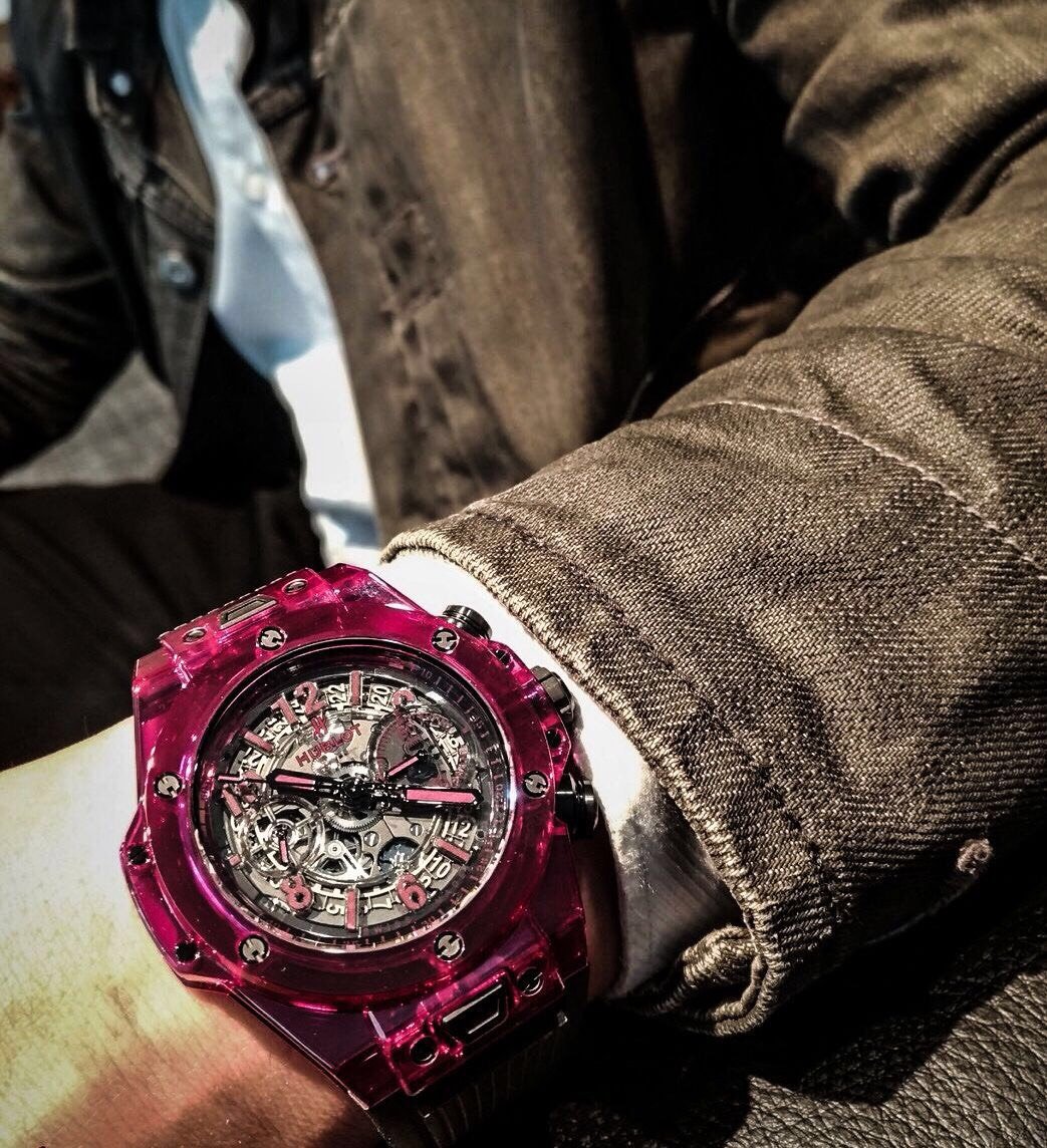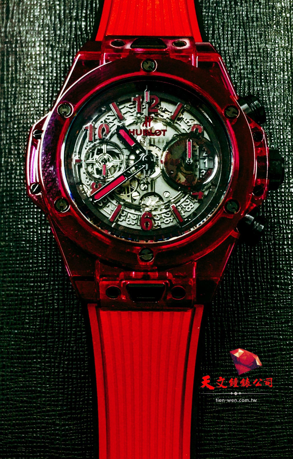 Big Bang Red Sapphire 魔力紅水晶腕錶 藍寶石水晶是很堅硬耐磨的材質,加上有良好的穿透性,也因此被用來作為腕錶的鏡面。但是它的製作過程非常困難,因為水晶硬度非常高(摩氏硬度9,只低於鑽石的摩氏硬度10),透過鑽洞、切割等加工過程很容易讓水晶碎裂,因此過去光是要製作有弧度的藍寶石水晶鏡面已經需要較高的技術,更何況是打造出有稜有角的錶殼呢?紅色藍寶石款式是結合氧化鋁(Al₂O₃)與鐵元素(Fe)加熱到攝氏2,000到2,050度所形成,十分神奇。限量 250只。