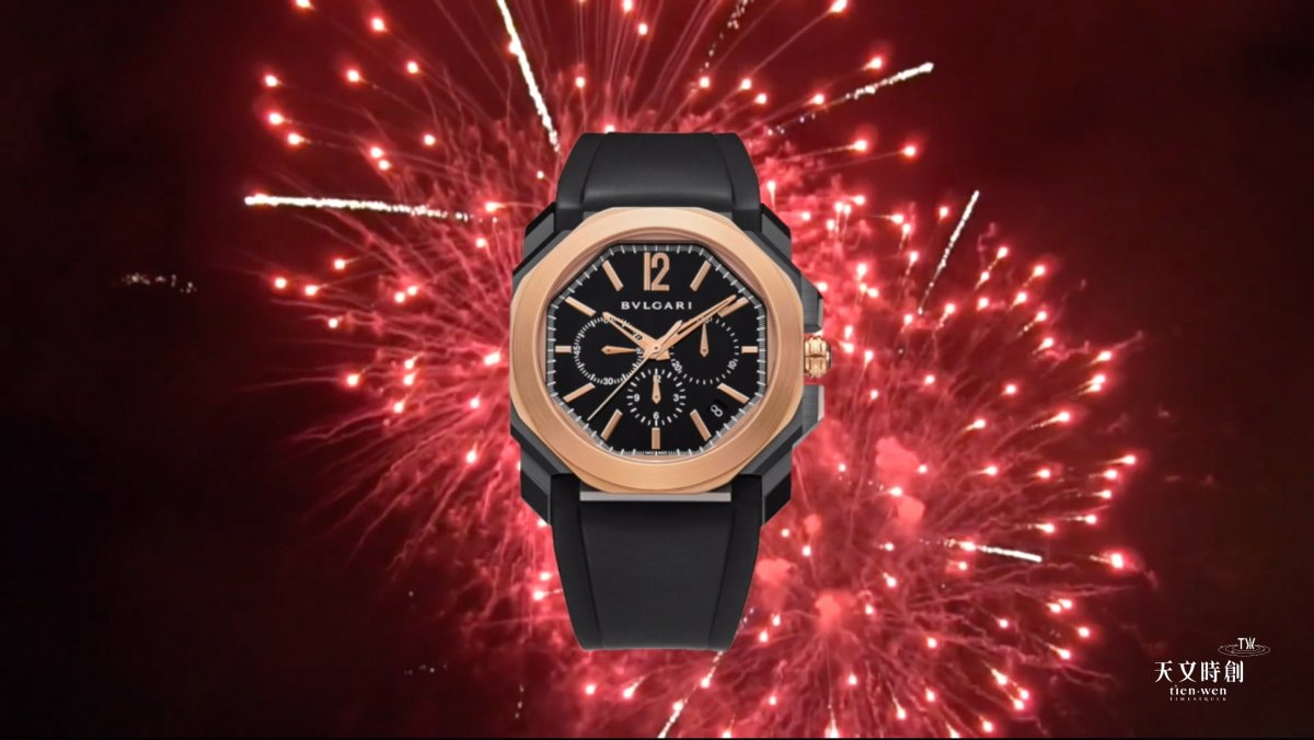 Bvlgari Octo Ultranero Velocissimo Chronograph 寶格麗八角黑金系列玫瑰金邊計時碼表腕錶搭載高振頻計時機械機芯,矽質擒縱裝置,自動上鍊,日期顯示。BVL 328-Velocissimo 機芯飾以珍珠圓點打磨紋,日內瓦波紋和倒腳拋磨處理。50小時動力儲存。錶徑41公釐, 噴砂精鋼錶殼經過DLC類鑽碳高耐磨鍍膜處理。18K玫瑰金八角形,18K玫瑰金錶冠,透明底蓋。霧黑色錶盤,手工鑲飾18K5玫瑰金時標。一體成型黑色橡膠錶帶和精鋼錶扣經過類鑽碳高耐磨度膜處理。防水深度100公尺。