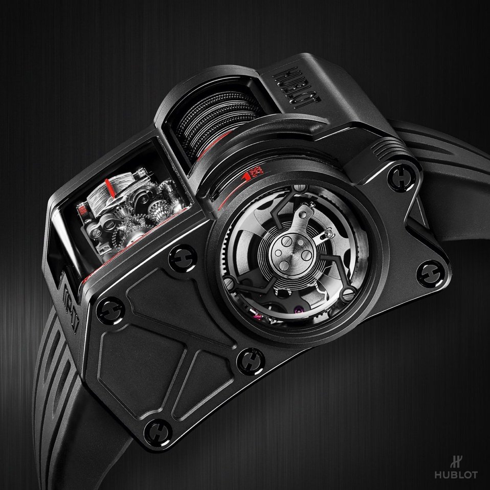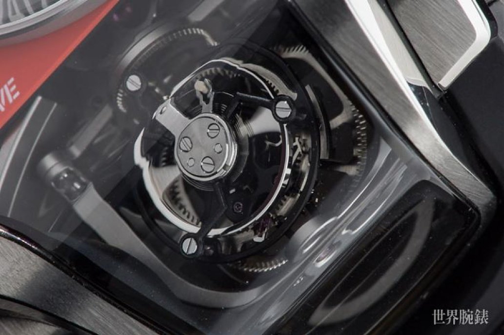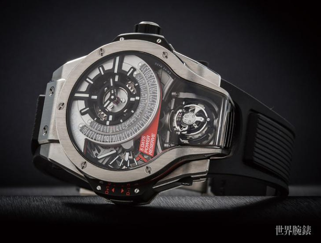 錶款設置的雙軸陀飛輪,宇舶錶HUBLOT首見「多軸陀飛輪」由於是立體化形式,因此要完整呈現陀飛輪的動態往往也需要將外殼打造出立體感,而宇舶錶HUBLOT MP-09的陀飛輪位在機芯的下半部,因此整個錶面也就順勢往下開口,錶鏡從平面到立面連成一氣,讓佩戴者能從上方與側面等角度細細品味內外層結構分別以一分鐘與30秒為週期旋轉的陀飛輪運作。