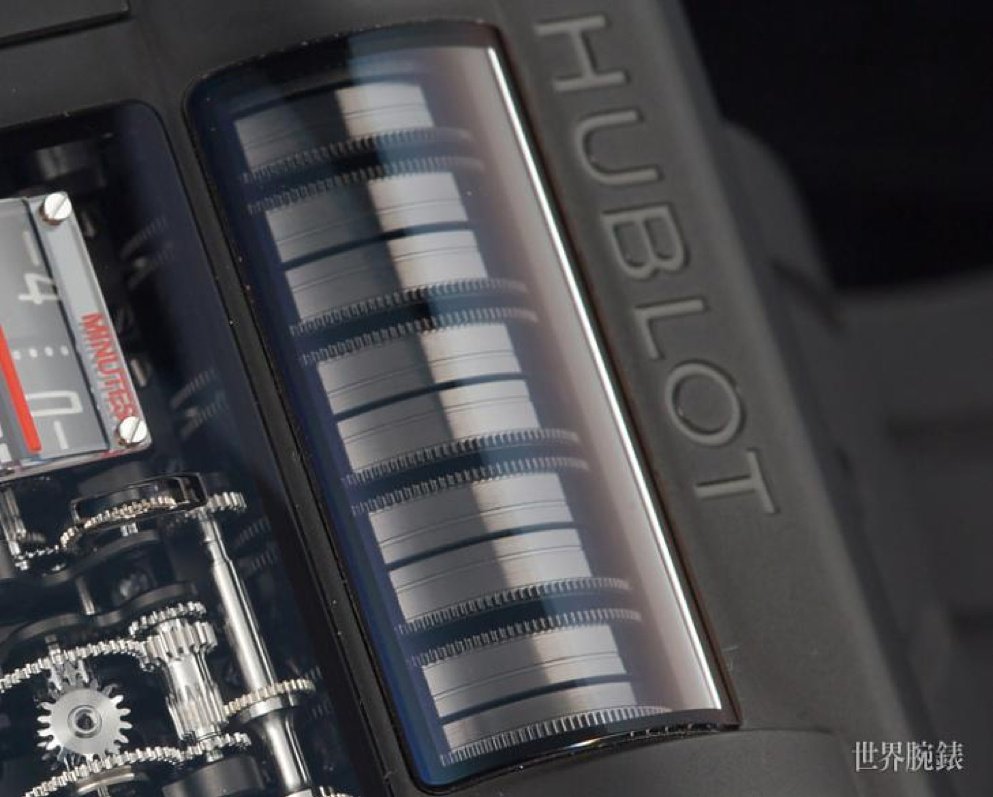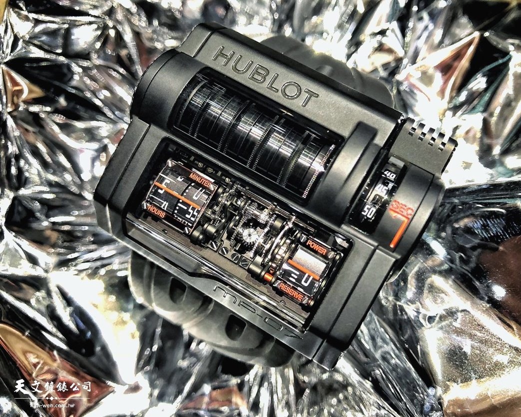 以超跑引擎概念的橫矩形式錶殼成為它深植人心的設計來源。在顯時方面,宇舶錶HUBLOT MP-07採用滾筒機制搭配指標,將尋常的時、分、秒顯示演繹得更富有賽車般的動感魅力,同時有鑒於機芯的橫向排列設計,宇舶錶HUBLOT MP-07的垂直陀飛輪罕見被置於面盤右上角,錶殼側面設有圓形放大視窗,得以露出飛行陀飛輪的運作美態,也更利於佩戴者盡興欣賞陀飛輪裝置的細節與作工。至於羅列於面盤上半部多達9枚的串聯發條盒則大方展示出錶款身負42日超長動能的優質工藝水準。