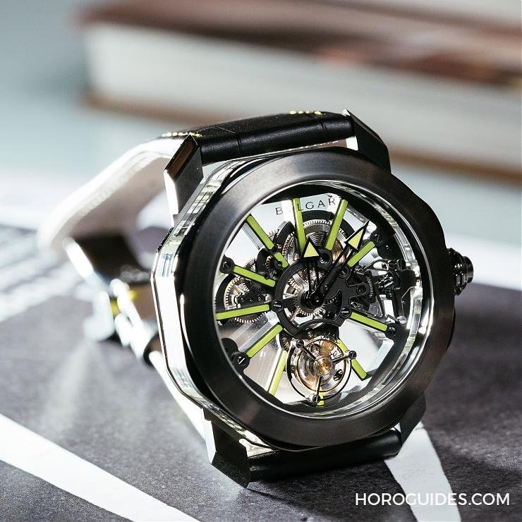 這只Octo Tourbillon Sapphire水晶鏤空陀飛輪,無論是鈦金屬螢光綠條板款式或鉑金梯鑽鑲嵌款式,從功能、工藝、設計,都是無懈可擊