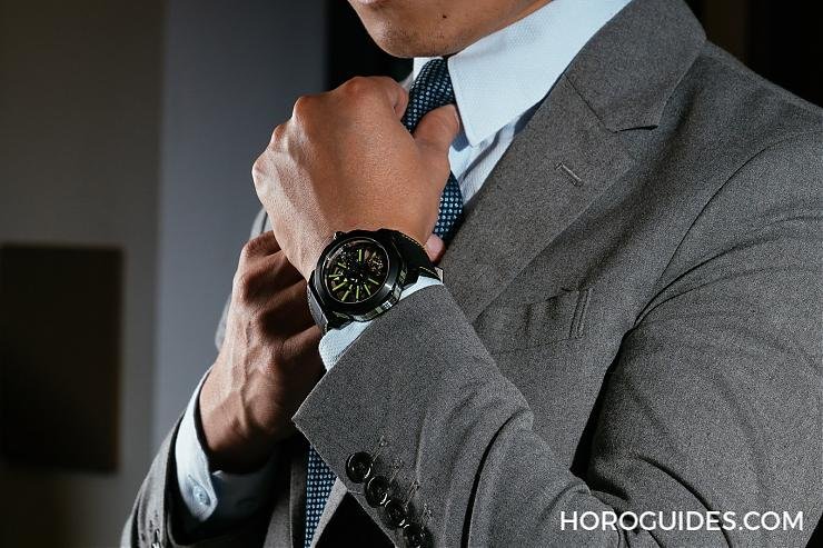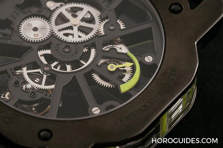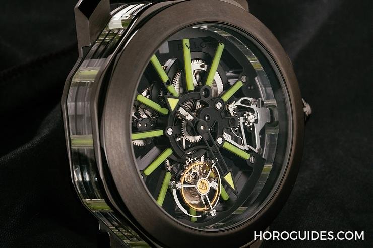 以黑色DLC類鑽碳鍍膜處理的鈦金屬打造的Octo Tourbillon Sapphire水晶鏤空陀飛輪腕錶,採螢光綠條板,翻製錶背可以看到腕錶動力儲能顯示