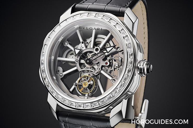 Octo Tourbillon Sapphire水晶鏤空陀飛輪以鉑金材質打造,錶徑為44mm,內部搭載BVL 206手動上鍊機芯,錶款鑲鑽約6.6克拉