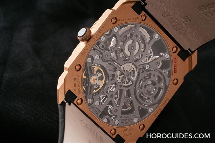 Octo Finissimo Skeleton融合了寶格麗招牌的超薄工藝,將機械零件變薄之餘還要加入鏤空技術,無論打磨機芯或製作上都非常耗費時間人力,更需要製錶師的專業與實力才能打造出一只Octo Finissimo鏤空腕錶。這只Octo Finissimo Skeleton內部搭載的事BVL 128SK手動上鍊機芯,機芯厚度僅2.35mm,仔細欣賞機芯,可見機芯夾板與橋板細節都做了相當細緻的拋光與倒角處理,搭配上特別採用噴砂處理的玫瑰金錶殼,風格低調又不失特色