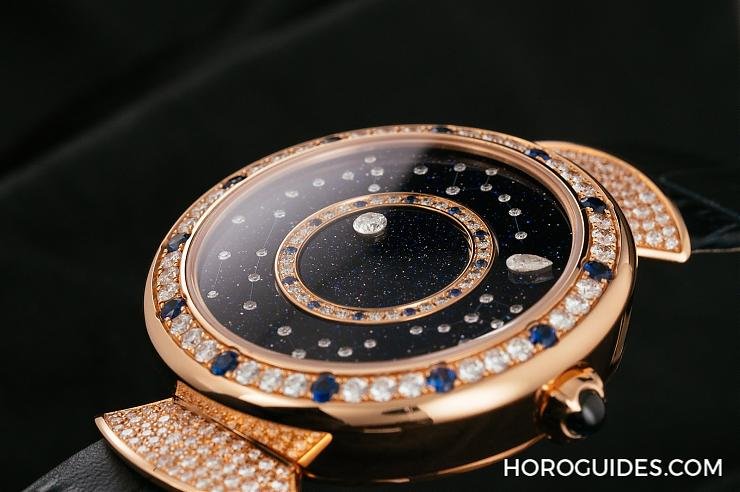 Q:如果要推薦一款寶格麗的女錶,你的選擇是? A:我一定會選擇Divas’ Dream!Divas’ Dream在外型設計上同樣識別度非常高,招牌的扇形錶耳,讓人一眼就知道是寶格麗的設計,像這款Divas’ Dream Roman Night腕錶,雖然功能上只是簡約的時分顯示,但寶格麗採用旋轉面盤,中央盤面上鑲飾了一顆圓形鑽石代表小時,面盤外圈以水滴形鑽石代表分鐘,面盤以砂金玻璃打造,並印有星座圖,彷彿深沈夜空,女生看一眼,絕對會被她的設計吸引住