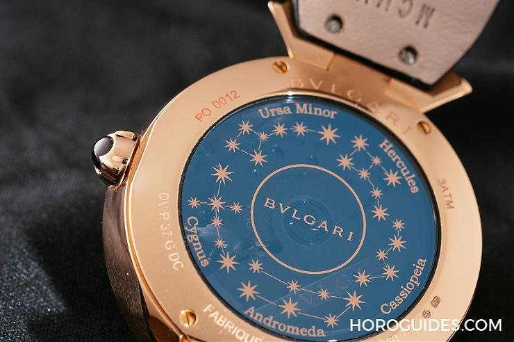 翻至Divas’ Dream Roman Night錶底,寶格麗特意採用煙燻色的藍寶石水晶玻璃,當你偏轉角度,就能看見內部搭載的BVL 308自動上鍊機芯