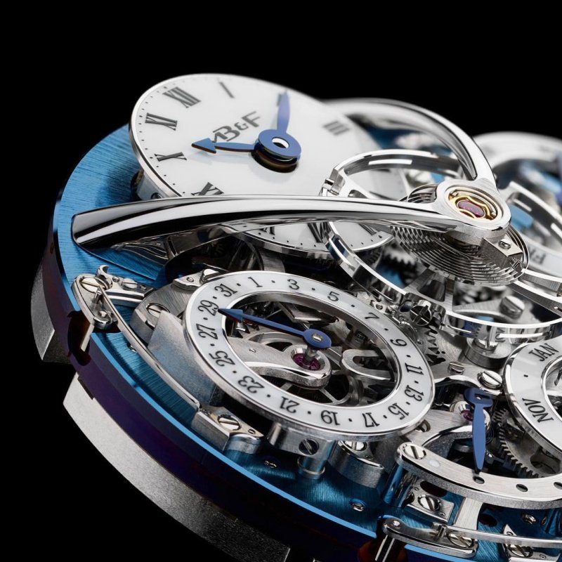 機芯: 全整合式萬年曆機制,由 Stephen McDonnell 專為 MB&F 打造,搭配錶盤側複雜機制與機械處理機制系 統結構,內建安全機制。