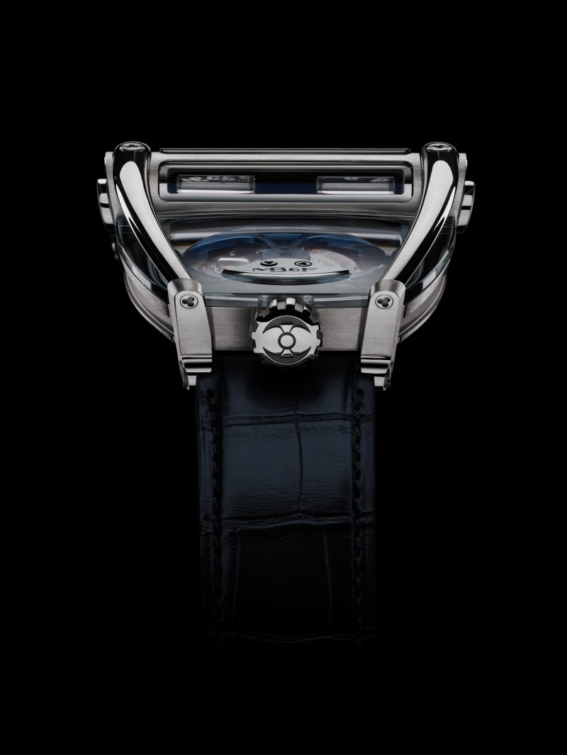 轉盤呈水平姿態於機芯上旋轉,透過透明的引擎蓋,可窺見轉盤於角落運作著。然而時間的顯示,是位於錶殼前方的「儀表板」上,採垂直配置。為了達成這樣的閱時方式,MB&F與高精密光學玻璃供應商合作,研發呈反光效果的藍寶石水晶稜鏡鏡面,90度反射映照於顯示盤的光線。稜鏡鏡面也將時計放大了20%,大幅提升閱讀性。