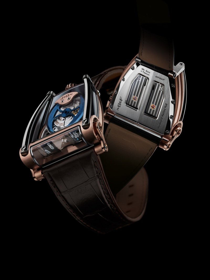 HM8 Can-Am由Girard-Perregaux製機芯驅動品牌自製的時分指示器,呈現雙向跳時與順轉分鐘顯 示。為了上方的自動盤,機芯經過了倒置,並經過特殊設計以將動力運送至稜鏡指示器。由於從錶面上就能直接欣賞機芯全貌,因此機芯工藝毫無疑問也必須為頂級的水準。動力儲存42小時。