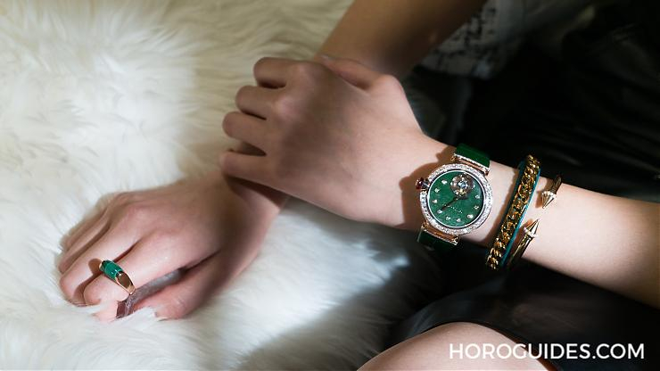 「LVCEA陀飛輪錶盤採用翡翠打造,位於錶盤6點鐘方向的陀飛輪更是讓人無法移開目光。」