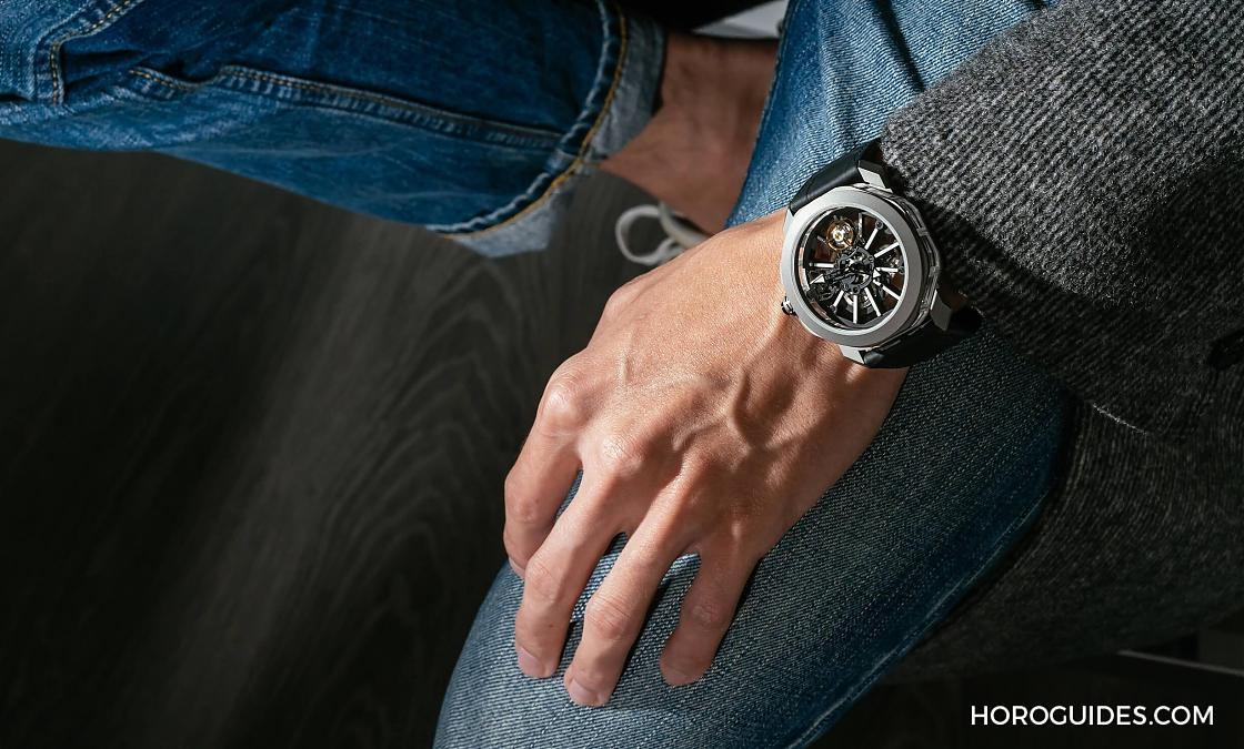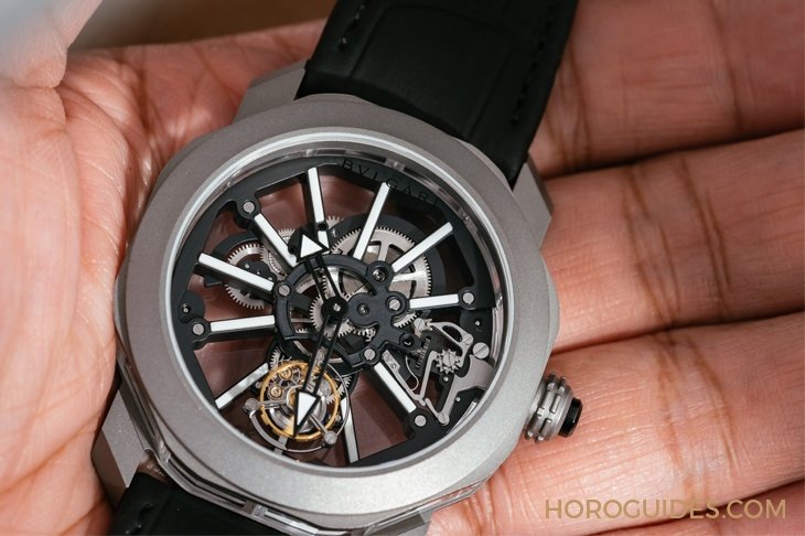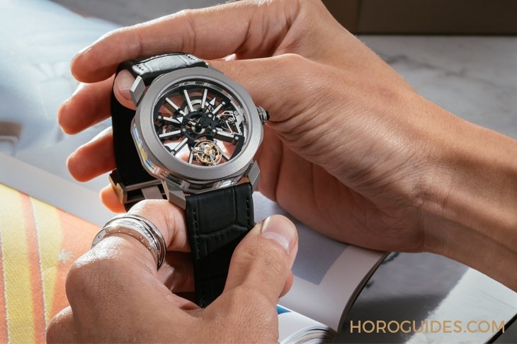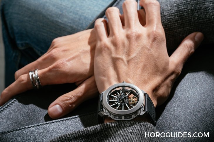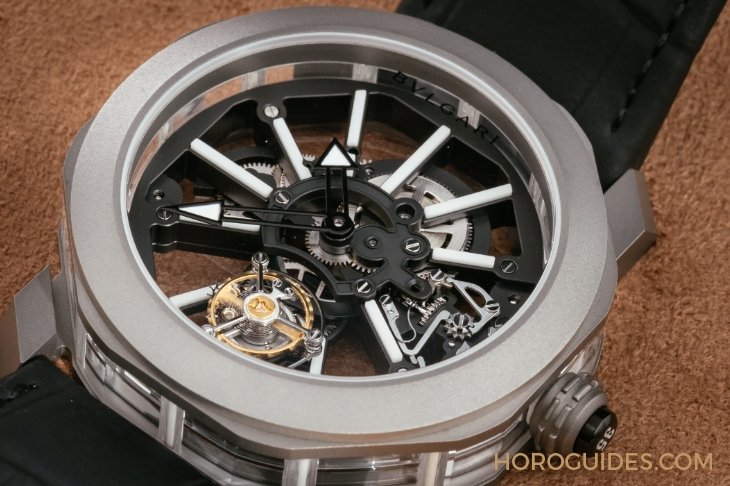 Octo Tourbillon Sapphire水晶陀飛輪是今年的新作,除了通透之外,鈦金屬材質也讓它的重量更為輕巧。
