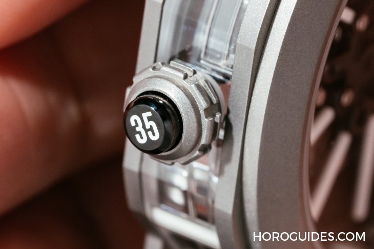 絕大多數的錶款,限量編號都是刻在錶背,不過水晶陀飛輪的限量編號,是刻在錶冠上,字體也選得很合宜,在設計上多了一點細節。
