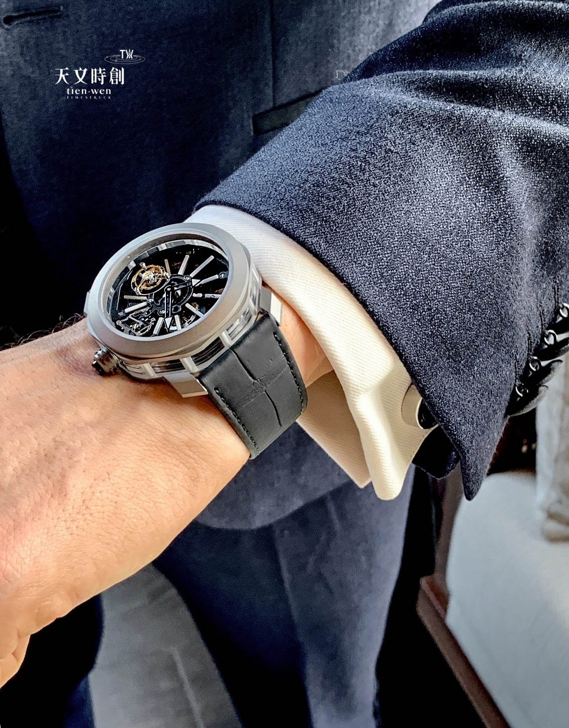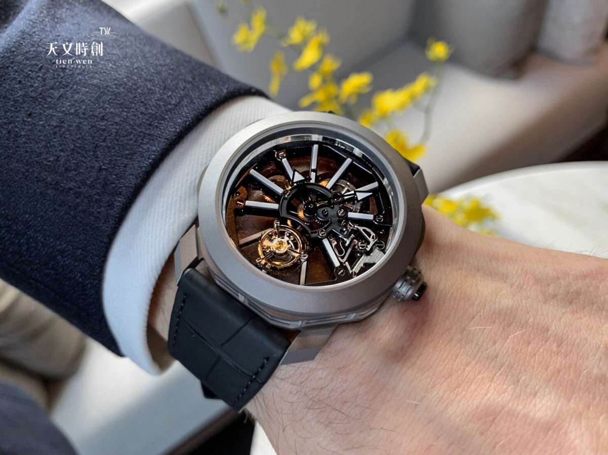 寶格麗之前的水晶陀飛輪出過綠色和藍色的螢光橋板,今年又推出白色的新色,和之前黑色DLC的錶殼作法不太一樣,這次是以磨砂鈦金屬的質地展現,看起來很厚實、錶徑也有44mm這麼大,但男生戴上手之後,尺寸其實滿剛好,而且鈦金屬結合藍寶石水晶,整體重量也顯得很輕,戴上手完全沒有沉的感覺,而且錶耳往內側做了一道斜角,等於將錶耳內縮,所以戴上之後也比較不卡手。