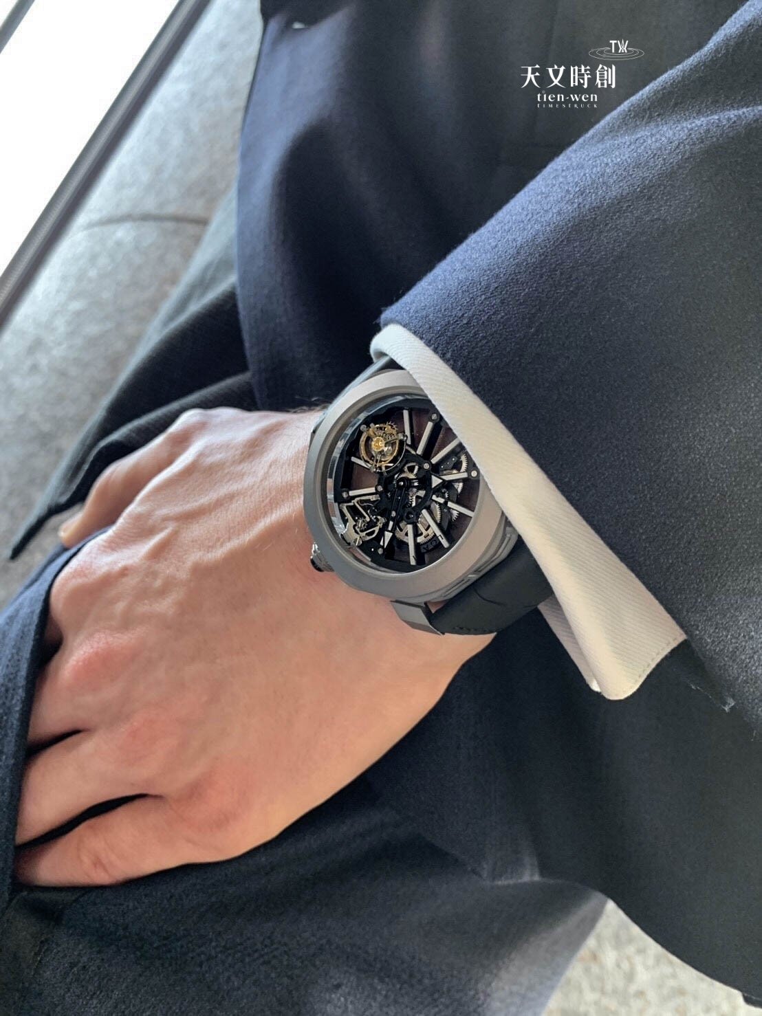 水晶陀飛輪腕錶雖然看起來有點厚度,但上手後的重量感很輕,錶耳往內切的設計也比較不卡手。
