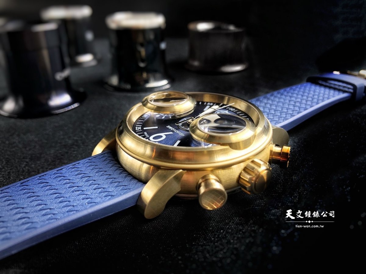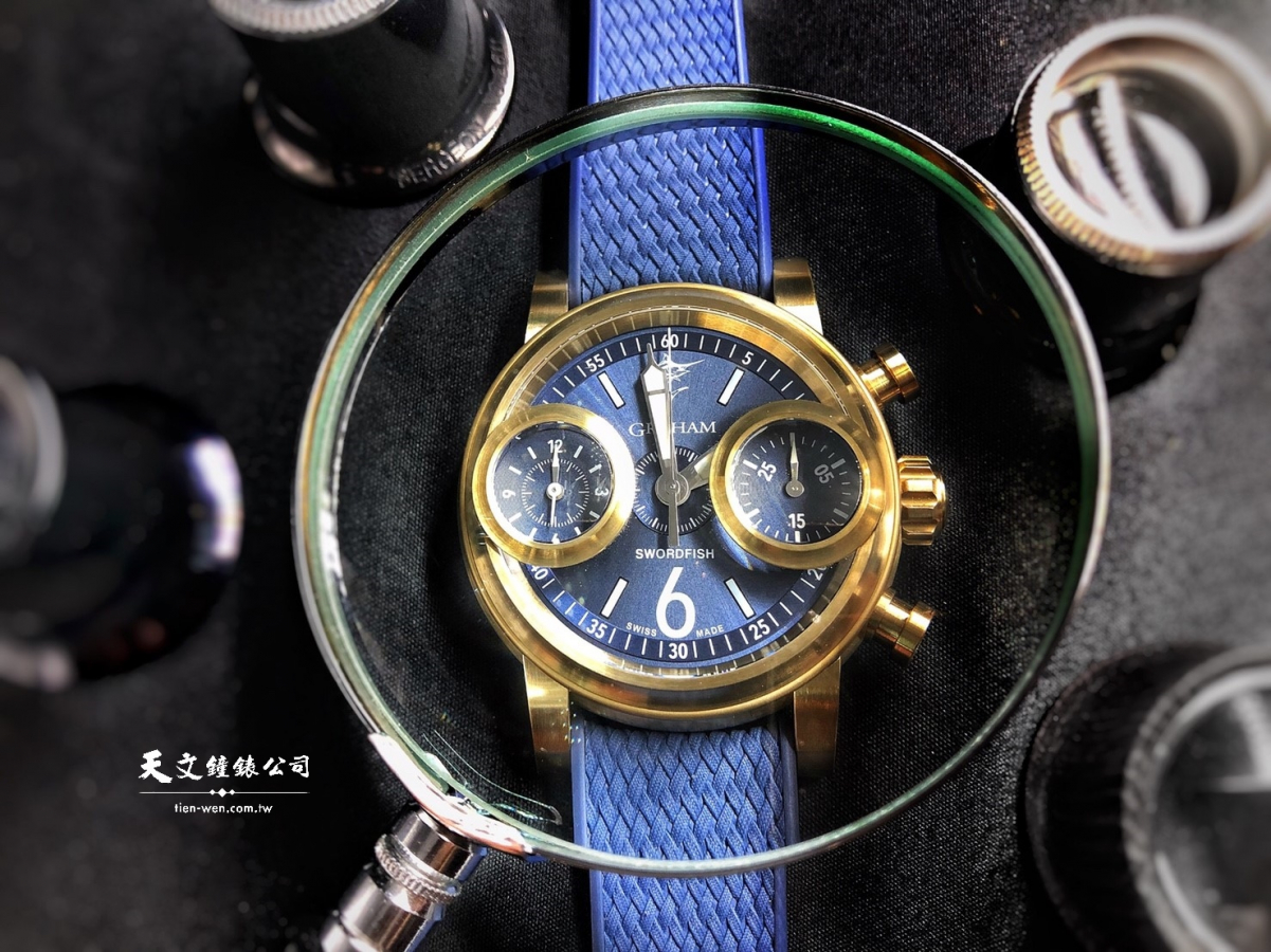 錶殼直徑46mm的大尺寸,但就Swordfish還有到48mm的款式來說,好像也算是相對溫和的尺寸,湛藍色面盤12點鐘位置有著象徵錶名Swordfish的劍魚圖騰。錶鏡上兩枚筒狀放大窗,彷彿大型魚類的眼睛,錶款名為格林漢青銅劍魚GRAHAM Swordfish Bronze便源自於此。而這樣的設計對應到雙眼計時形式,也顯得恰到好處,正好用以取代雙眼計時的兩個小錶盤。此外,這兩個錶鏡也有放大功能,能把副錶盤的視覺面積放大20%,在判讀上會更為顯著。