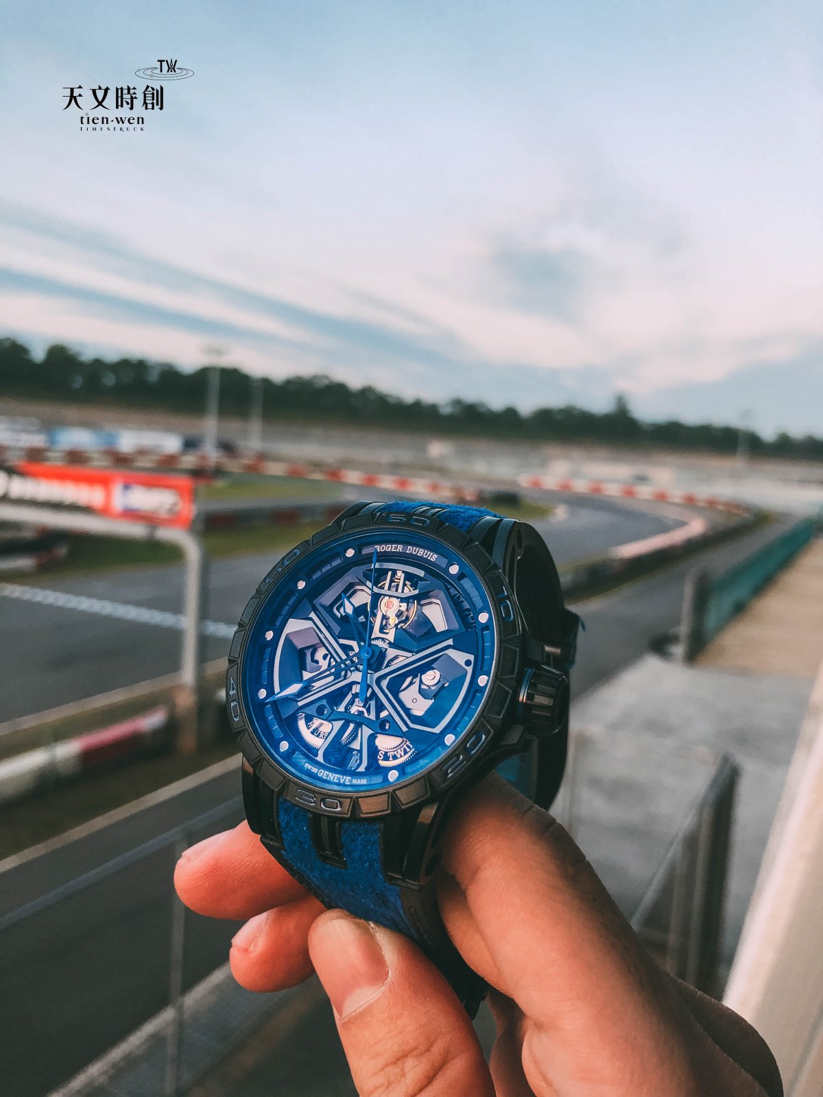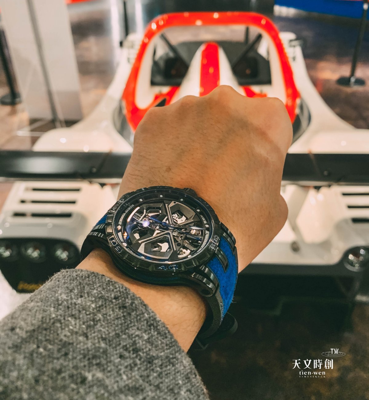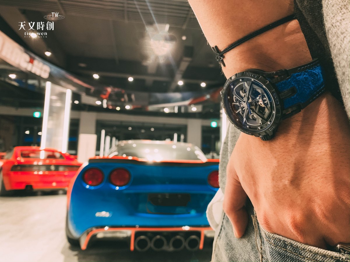 Excalibur Huracan鏤空自動上鍊腕錶藍色款所搭配豪邁帥氣的錶殼,採用了以堅實性(安全效益)和輕盈度(性能效益)聞名的碳纖維材質,展現出Roger Dubuis羅杰杜彼與Lamborghini Squadra Corse藍寶堅尼賽車部門應用顛覆性材質於自身專業領域上所具有的精深掌握能力。另外值得一提的精湛創意是,相對於傳統機械機芯而言,轉換了方位的游絲擺輪,確保佩戴者能夠充分享受觀賞腕錶機芯的樂趣。