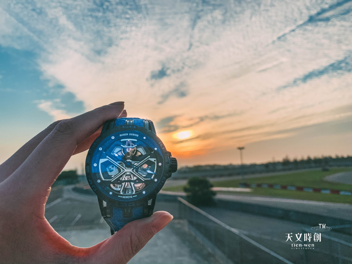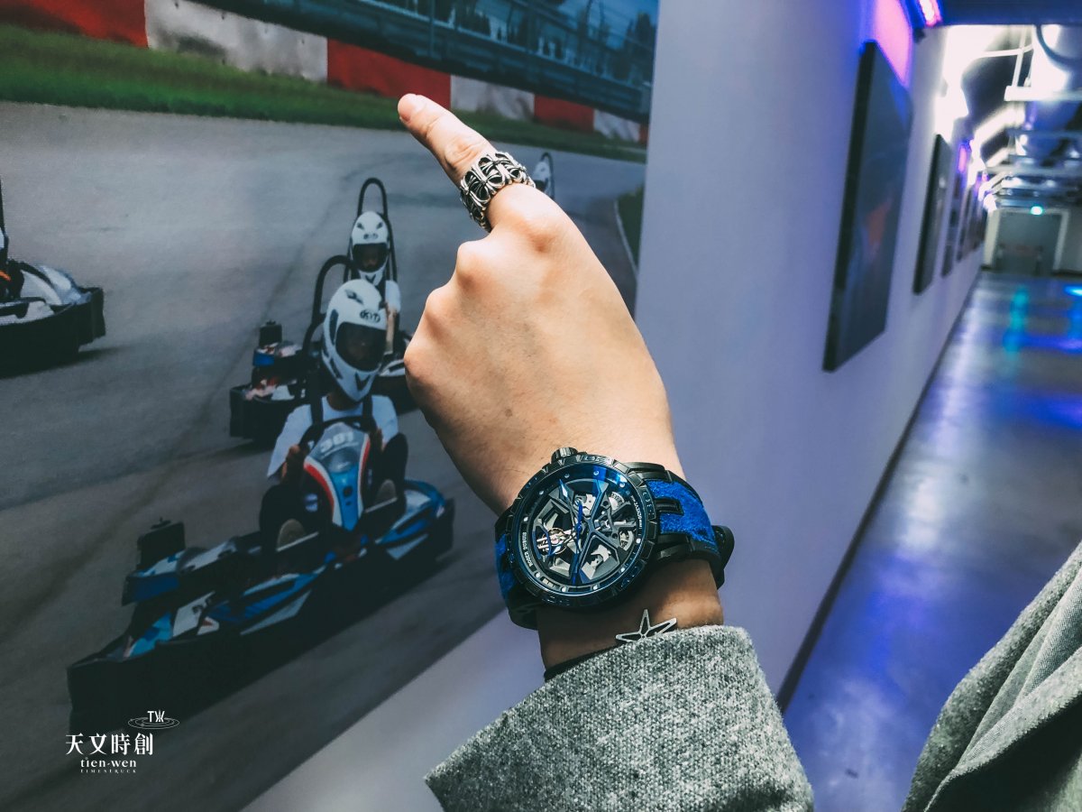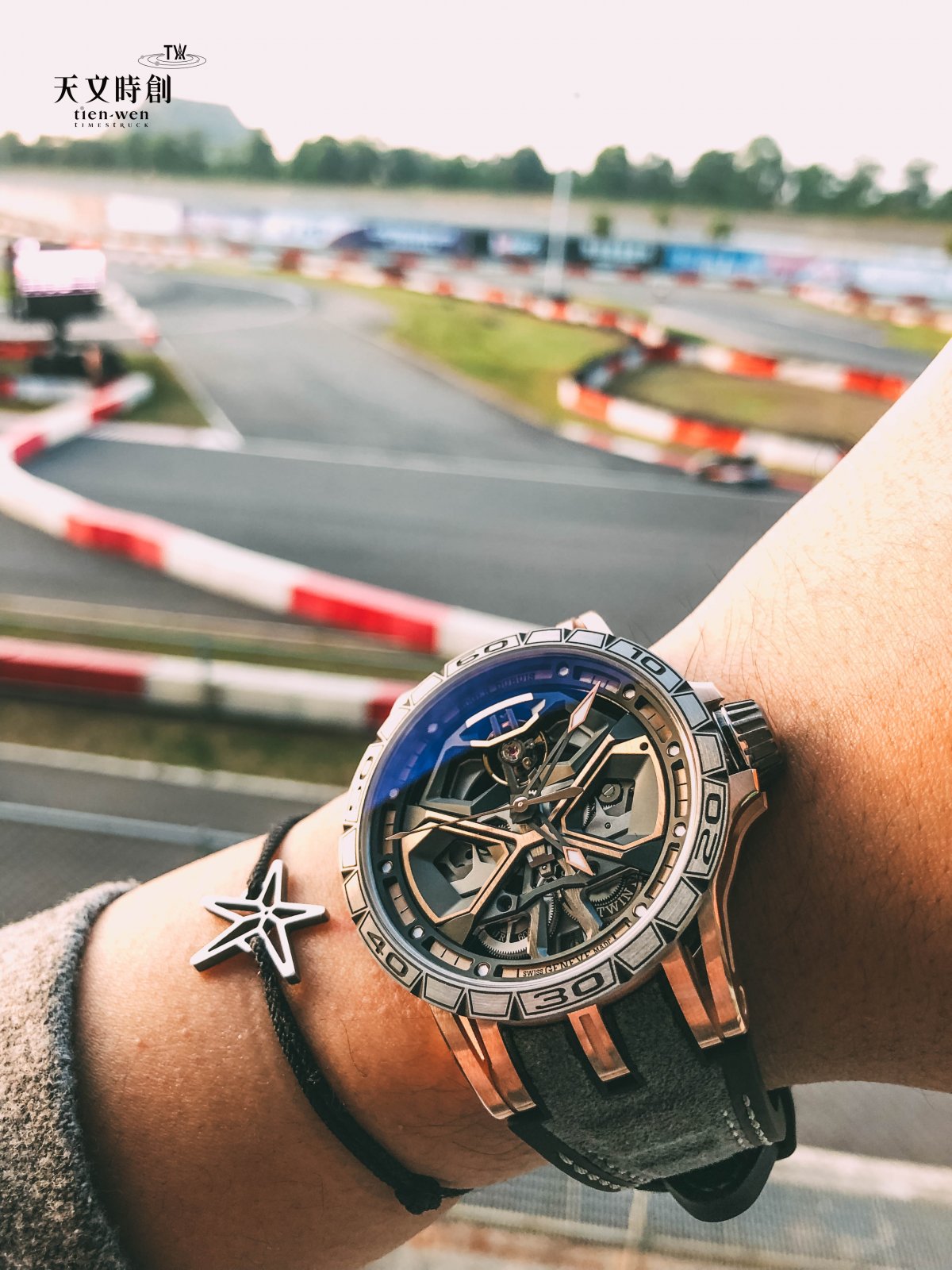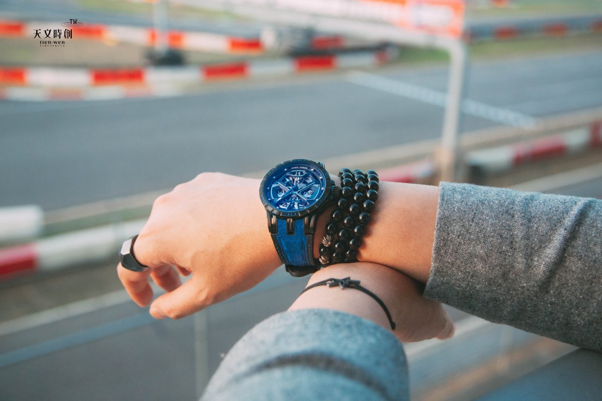 Excalibur Huracan鏤空自動上鍊腕錶藍色款所搭配豪邁帥氣的錶殼,採用了以堅實性(安全效益)和輕盈度(性能效益)聞名的碳纖維材質,展現出Roger Dubuis羅杰杜彼與Lamborghini Squadra Corse藍寶堅尼賽車部門應用顛覆性材質於自身專業領域上所具有的精深掌握能力。另外值得一提的精湛創意是,相對於傳統機械機芯而言,轉換了方位的游絲擺輪,確保佩戴者能夠充分享受觀賞腕錶機芯的樂趣。