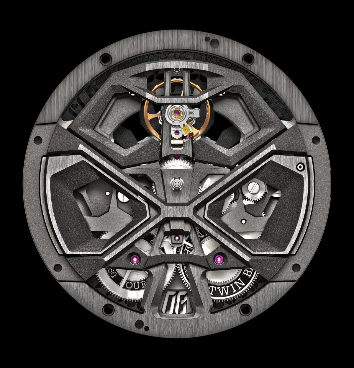 此款腕錶所搭載的機芯是品牌與Lamborghini Squadra Corse林寶堅尼合作中所研發的第二款機芯。此嶄新「引擎」配備12度傾斜擺輪和擒縱機構,以及一個形似輪輞的圓形擺陀作為自動上鏈機制。 機芯上部的夾板則效仿Lamborghini Huracán超跑車V10引擎的「引擎室拉桿」設計。