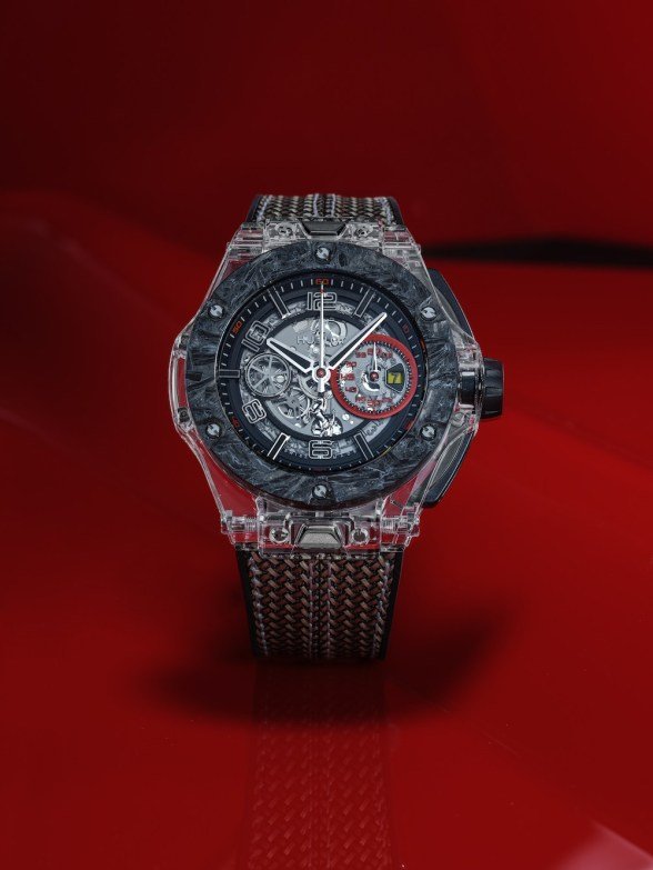 第三款腕錶具有通透外觀,一眼便可辨識出錶殼由藍寶石所打造,一種硬度超高、極難加工的創新材質,營造出一種強烈的未來主義風格。極致精密的高雅質感,蘊含著科技將帶領我們創造出無限可能性的未來。這項創新承諾同時能夠印證在汽車製造業與頂級製錶業。Kevlar克夫勒防彈纖維材質打造的錶帶,再次呼應法拉利超跑的高科技未來感。