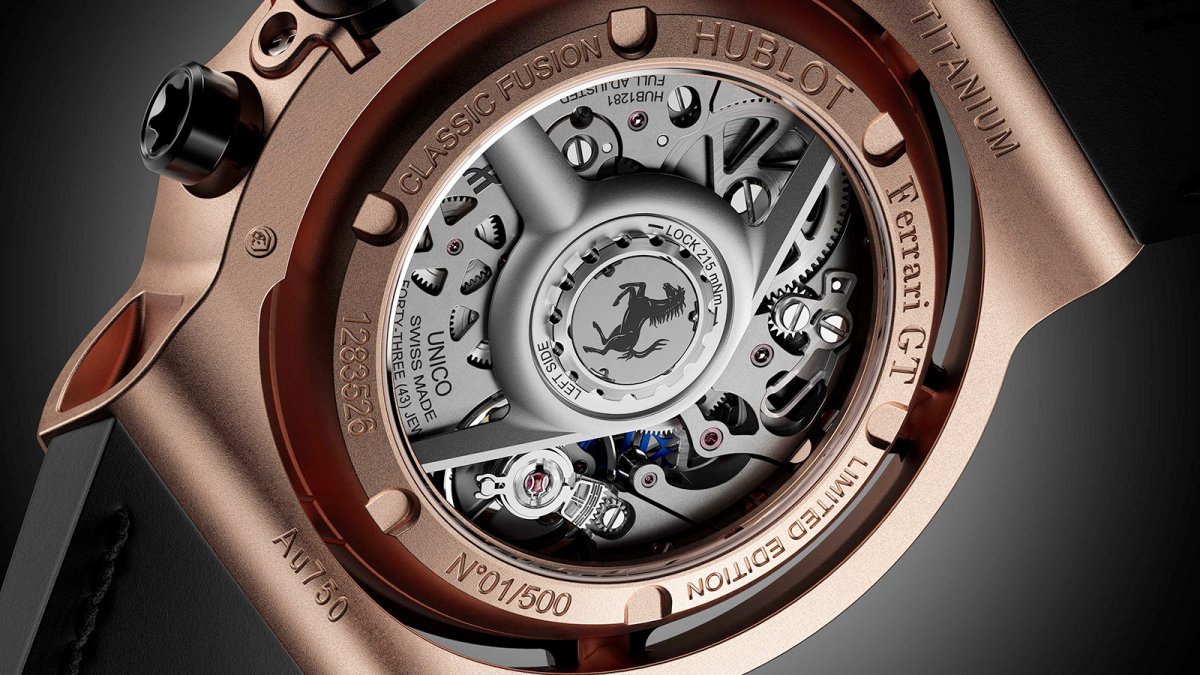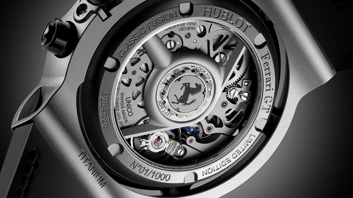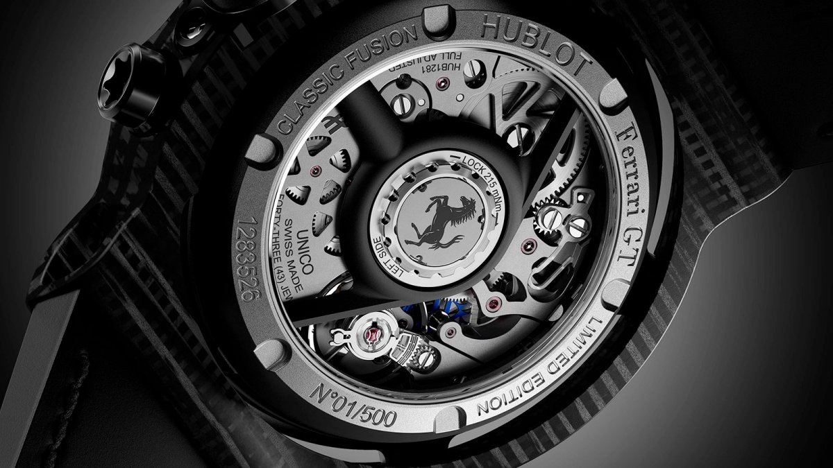 另一項創舉,則是將宇舶Hublot著名的UNICO自製機芯,搭載於直徑45毫米的經典融合系列錶殼內。HUB1280是宇舶Hublot的第二款自製計時碼錶機芯,發表於2018年。擁有四項專利技術,自動上鍊飛返計時碼錶機芯,振頻4Hz(每小時28,800 次),從面盤可視的導柱輪,擁有能夠與冠軍相匹配的技術規格,尤其是厚度僅6.75毫米的纖薄體積,卻擁有對於日常佩戴非常實用的三日動力儲能。全新經典融合法拉利GT腕錶共推出三種不同材質錶殼,包括鈦金屬版限量1,000只、皇金版及3D立體碳纖維版均限量500只。
