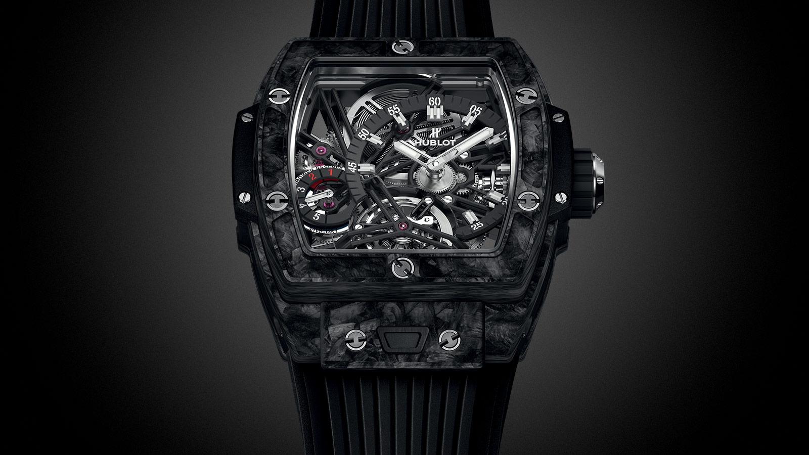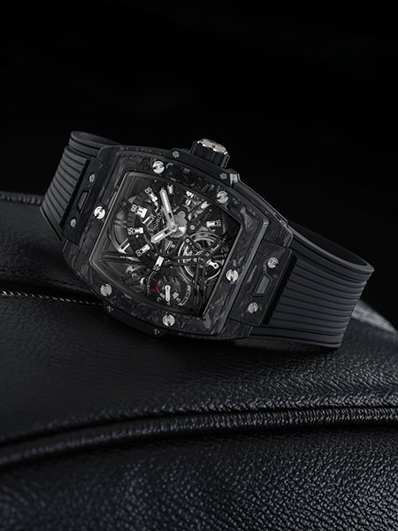 宇舶HUBLOT Spirit of Big Bang系列腕錶的造型與眾不同,忠實承襲宇舶HUBLOT Big Bang經典設計元素。源起於融合的藝術(Art of Fusion)的製錶理念,並持續在材質領域突破創新:宇舶HUBLOT全新Spirit of Big Bang陀飛輪腕錶首次採用碳纖維酒桶造型錶殼,搭配黑色及藍色的特殊紋理,展現優雅前衛的風格。碳纖維錶圈以6個H型鈦金屬螺絲固定;碳纖維材質的錶圈搭配錶背的藍寶石抗刮透明底蓋,融合之美躍然眼前。