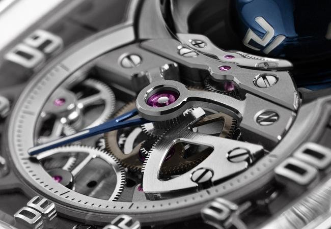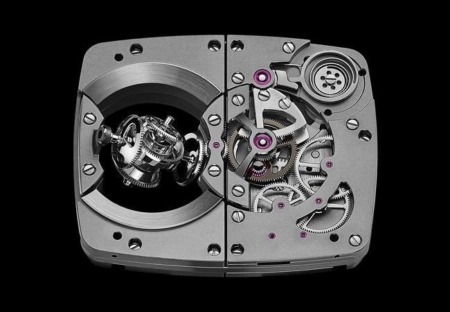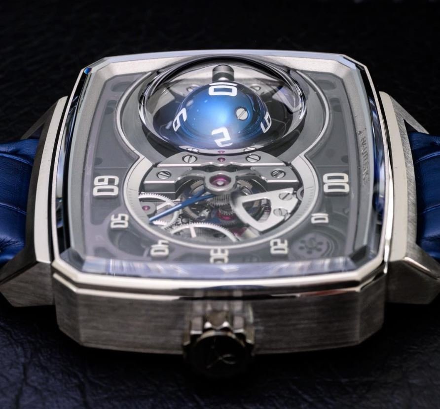球體上鐫刻十二個代表小時顯示的數字以三根軸控制轉動,以瞬間翻跳的方式顯示當下時。隨機韻律翻跳的小時顯示球體,其實是經過嚴格的機械輪系編排而來─透過四個錐形齒輪環繞兩根互相交叉且呈21度傾斜的軸心,構成一個差動輪系以進行猶如舞蹈特技的跳翻顯時。以兩塊藍色PVD鍍層工藝處理的拋光鈦金屬殼體裝置在這個錐形差動輪系上,共同構成和諧平衡的「陰陽球」。球體的右邊是逆跳分鐘顯示,一根分針環繞精緻優雅的分鐘軌道精准走時,半鏤空面盤下可直觀部分的擺輪運作與機芯結構。