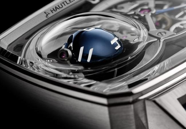 豪朗時HAUTLENCE HL Spherical球體翻時腕錶,球體的右邊是逆跳分鐘顯示,半鏤空面盤下可直觀部分的擺輪運作與機芯結構。
