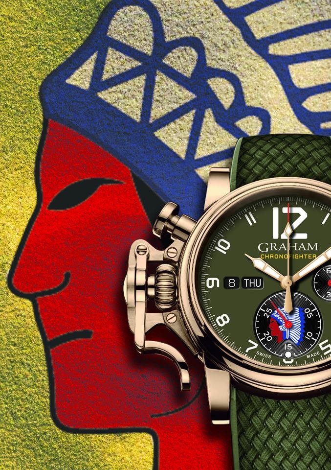 格林漢GRAHAM的Chronofighter可說是品牌旗下最能展現如此態度的表率。貫徹以手榴彈保險梢為靈感,打造出兼具錶冠護橋,形貌獨特的按壓式計時碼錶按把,強烈的風格成為系列主要特色。這強烈加入古典的設計線條,搭配洋蔥頭錶冠,令剛強奔放的錶身線條,加入古典懷舊,帶些蒸氣龐克的韻味。今年推出結合雷射技術,將圖案雷射在藍寶石玻璃上,而限量編號也直接在玻璃錶盤上。限量五十隻。