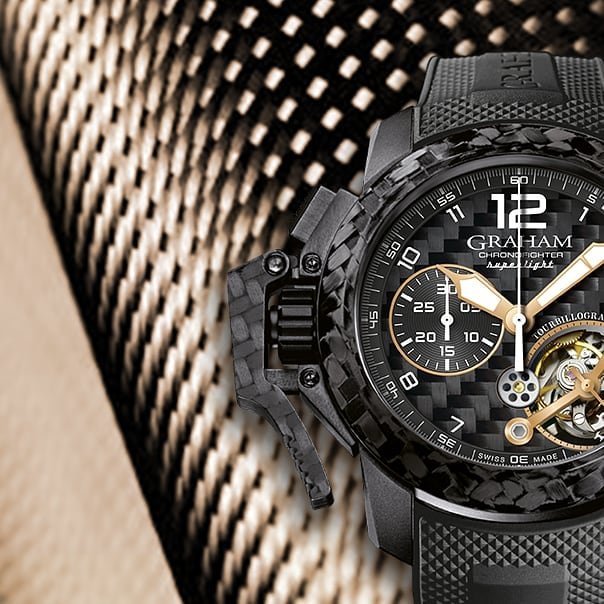 超輕盈的高科技碳結合超動感的造型,精確地反映出這些錶款完美結合外觀與機能的平衡美。而錶帶不受氣候影響,橡膠成份非常穩定。配上「巴黎釘紋」圖案,這些大膽、時髦的造型就如賽車般萬眾矚目。格林漢GRAHAM 的錶徑為47mm,重量卻不到100克,是因為錶殼是以目前並沒有太多品牌使用的奈米碳管(Carbon Nanotube)所製成。戴上手也非常舒適,輕盈到幾乎無感。而今年在錶盤增加了陀飛輪裝置!限量100隻