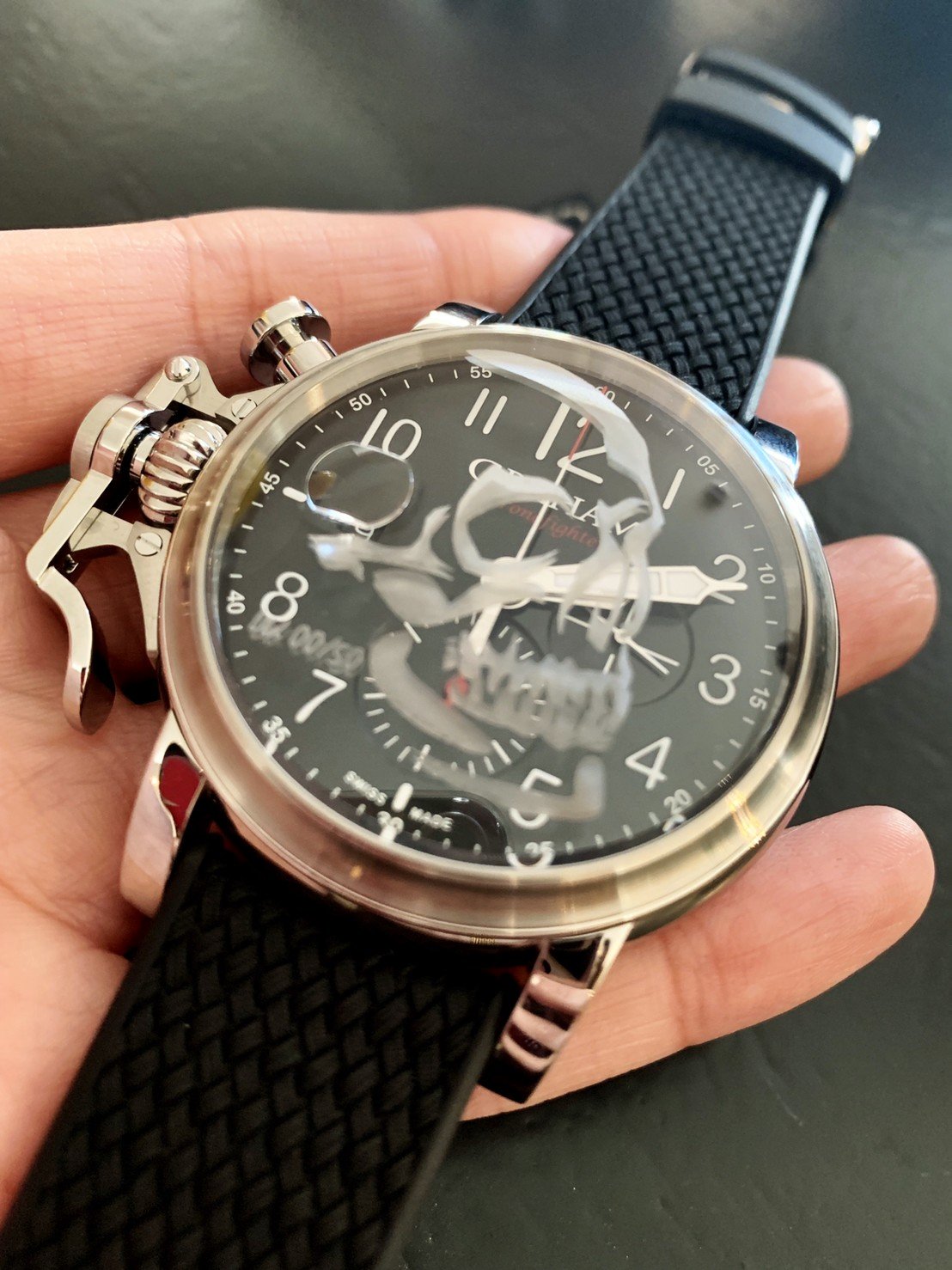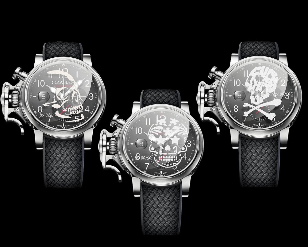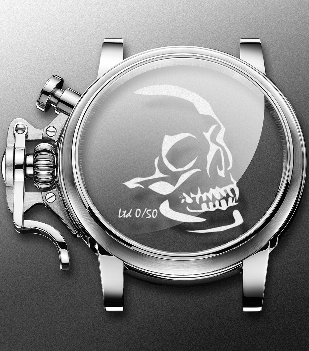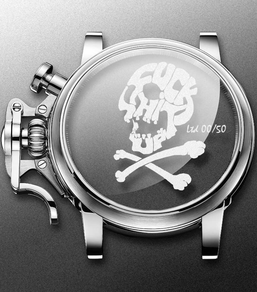 若提及非典型的傳統態度,格林漢GRAHAM的Chronofighter可說是品牌旗下最能展現如此態度的表率。貫徹以手榴彈保險梢為靈感,打造出兼具錶冠護橋,形貌獨特的按壓式計時碼錶按把,強烈的風格成為系列主要特色。這強烈加入古典的設計線條,搭配洋蔥頭錶冠,令剛強奔放的錶身線條,加入古典懷舊,帶些蒸氣龐克的韻味。今年推出結合雷射技術,將圖案雷射在藍寶石玻璃上,而限量編號也直接在玻璃錶盤上。限量五十隻。
