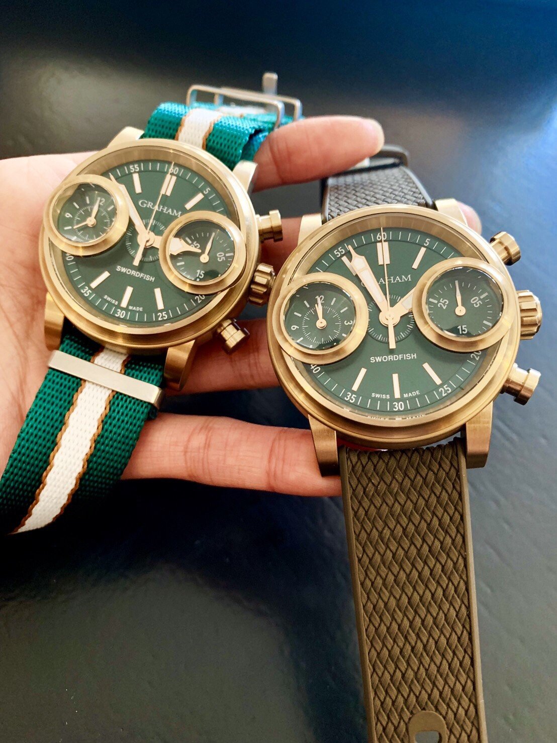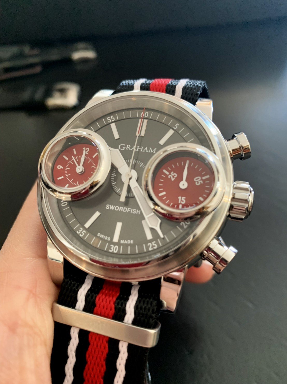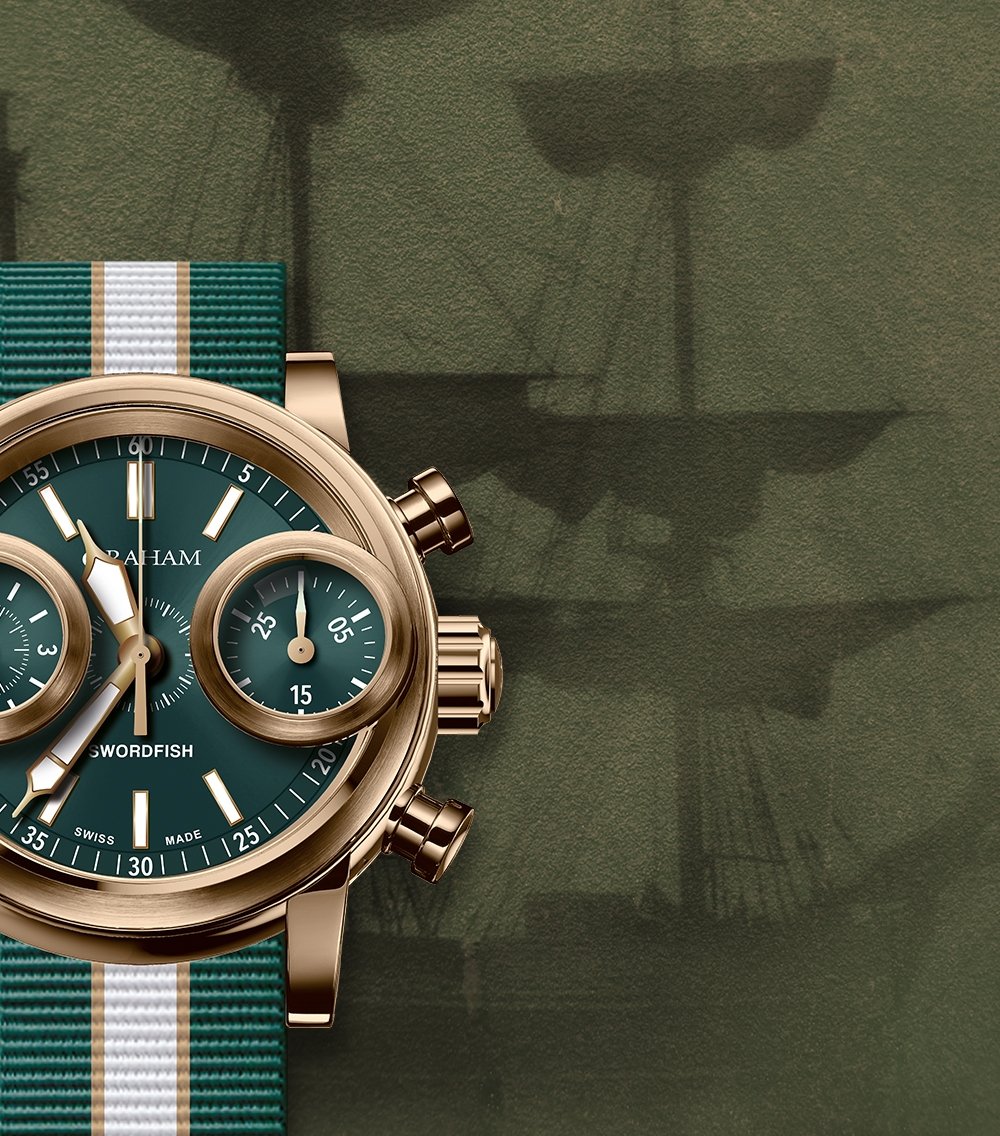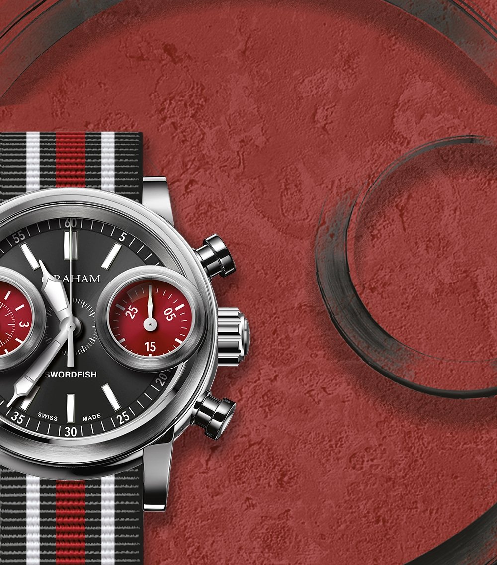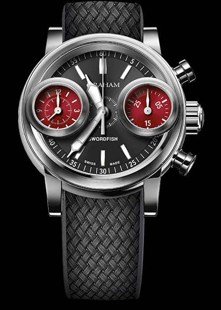 設計貫徹系列特色,雙眼計時碼錶功能,搭配如同雙筒望遠鏡般的放大錶鏡,就彷彿大型魚類明亮的雙眼,也正是錶款名為格林漢GRAHAM Swordfish劍魚的原因。而如此設計除了凸顯雙副錶盤外,也有能讓副錶盤的視覺面積放大20%的實際效用,提高判讀的清晰度。底蓋隱約可見內裝G1710自動上鍊機芯,振頻每小時28,800轉,這是品牌常用於此系列錶款的主要機芯,品質深受品牌信賴。在今年推出15週年紀念款,在雙眼計時碼錶盤以紅色呈現。