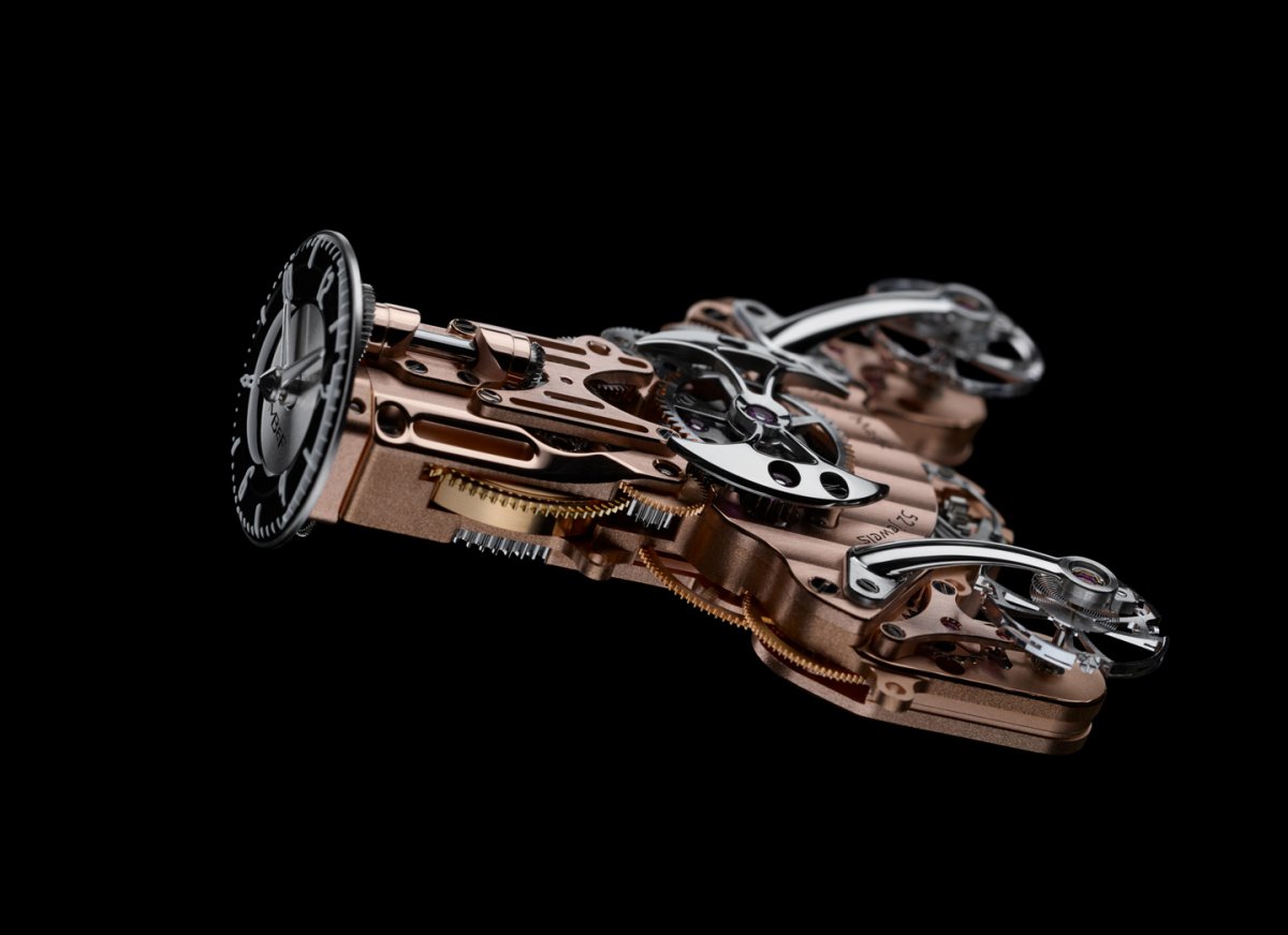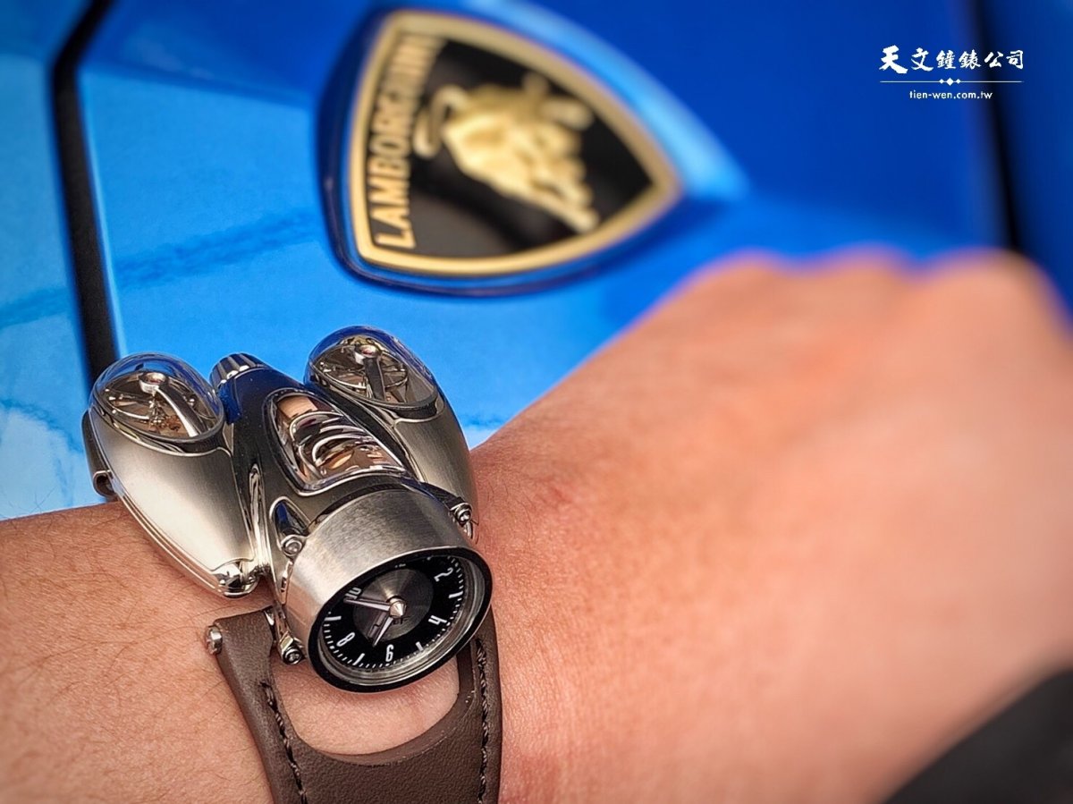 舉凡在那年代所設計的汽車、飛機都有著這類共通形象,HM 9 Flow也因此而生。一如過往HM系列的不按牌理出牌,除了身形獨特外,HM 9不只是此系列首度採用雙擺輪設計,同時也是系列首款手上鍊機芯,似乎品牌正逐漸打破HM與LM系列的界線。錶身結構彷彿某種飛行器的外型,前端為時間指示,後端左右兩邊則如同推進器般。而透過上方的藍寶石水晶可看到其中各安裝一枚擺輪。懸空外置的擺輪,其技術想來與LM2有脈絡傳承。