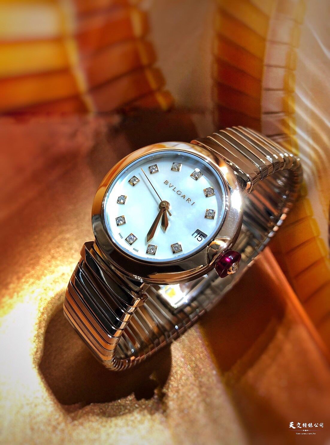 原型腕表仿照了羅馬帝王發行的古幣,把品牌標誌刻印在錶圈而非錶盤上,這創意設計備受好評。展現了寶格麗Bvlgari品牌的基本創意精神,搭配金屬錶鍊、錶殼纖薄精緻,錶冠鑲嵌的蛋面切割粉紅碧璽,正是寶格麗Bvlgari經典珠寶工藝的表現。同樣精緻珍貴的珠寶元素還展露在珠母貝錶盤上,錶盤鑲嵌明亮切割鑽石時標,不僅散發著經典韻味,當代元素的加持更令其光彩動人。現代優雅,嫵媚精緻,展現靈活搭配的樂趣。