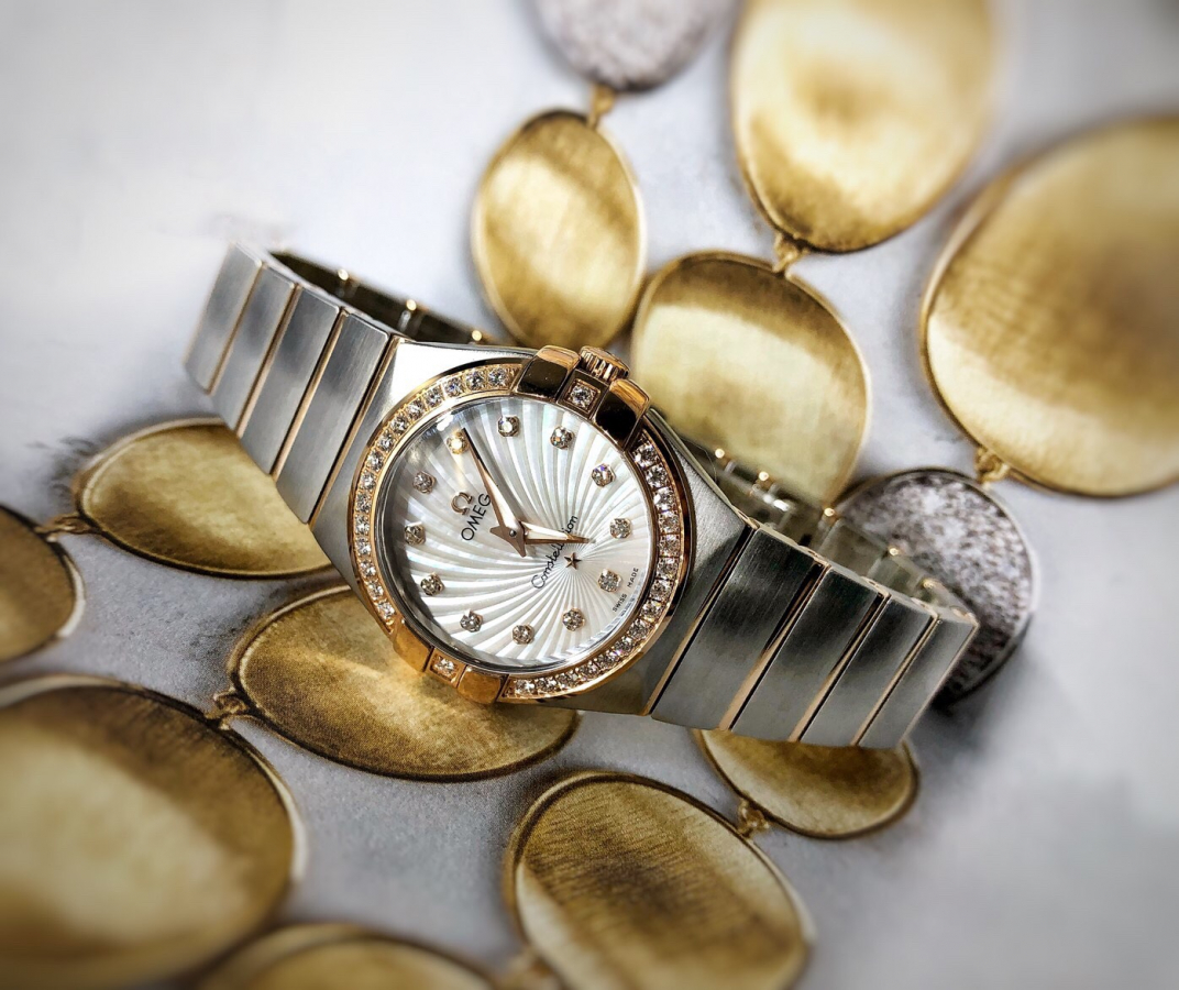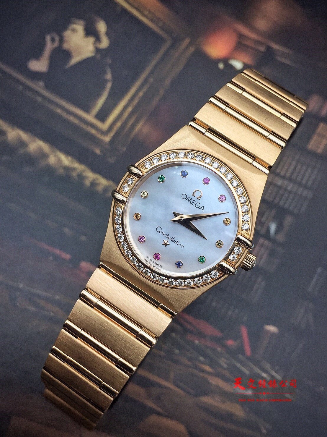歐米茄星座系列18k黃金,錶徑27毫米,彩色寶石時標。珍珠母貝面盤