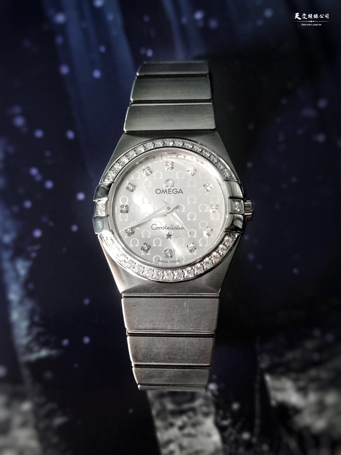 歐米茄星座系列不鏽鋼款,錶徑27毫米,鑲嵌鑽石。整列排序歐米茄標誌銀色錶盤