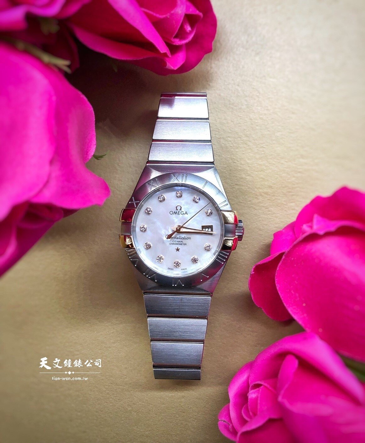 歐米茄星座系列不鏽鋼半金款,錶徑27毫米,放射狀星芒紋理的白色珍珠母貝錶盤