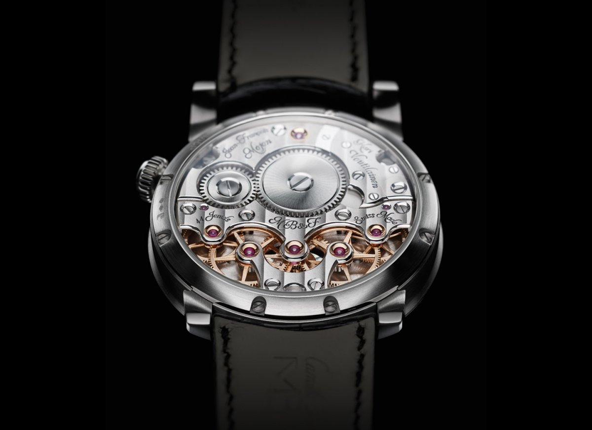 古典風格的機芯,當然一定要是手上鍊的。透過一枚發條盒推動兩組齒輪系。錶背上同樣鐫刻著負責這部分的大師名號,研發處理運作問題的是Jean-François Mojon,而為機芯妝點打磨的則是Kari Voutilainen,兩位皆是曾經獲得日內瓦鐘錶大賞的大師級人物,也是打造LM1的原班人馬。機芯上鐫刻著帶著古典花俏的英文字體,感覺相當的好。