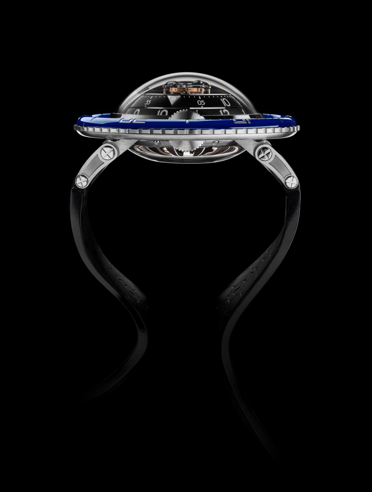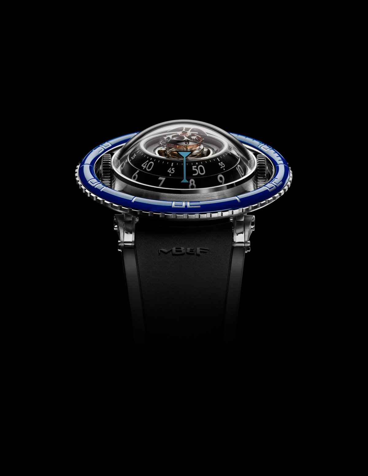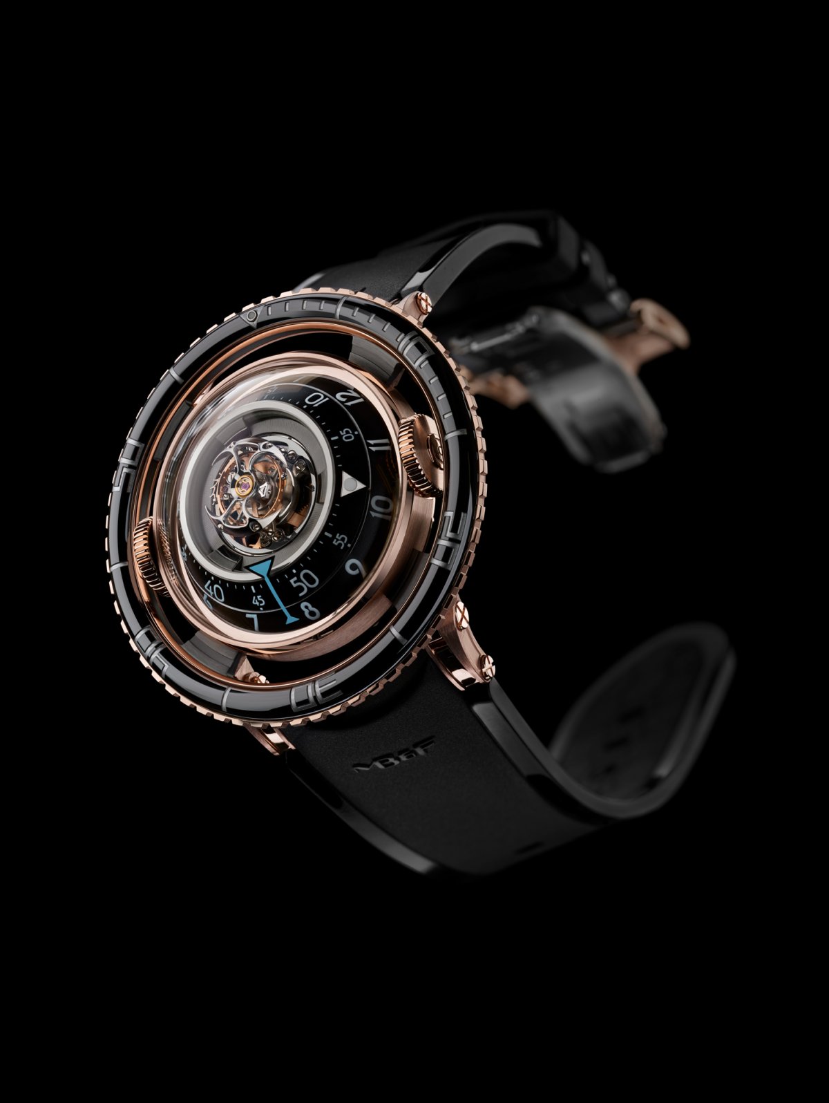 機芯:3D 立體垂直結構、自動上鍊、由 MB&F 設計研發 中央設置 60 秒飛行陀飛輪