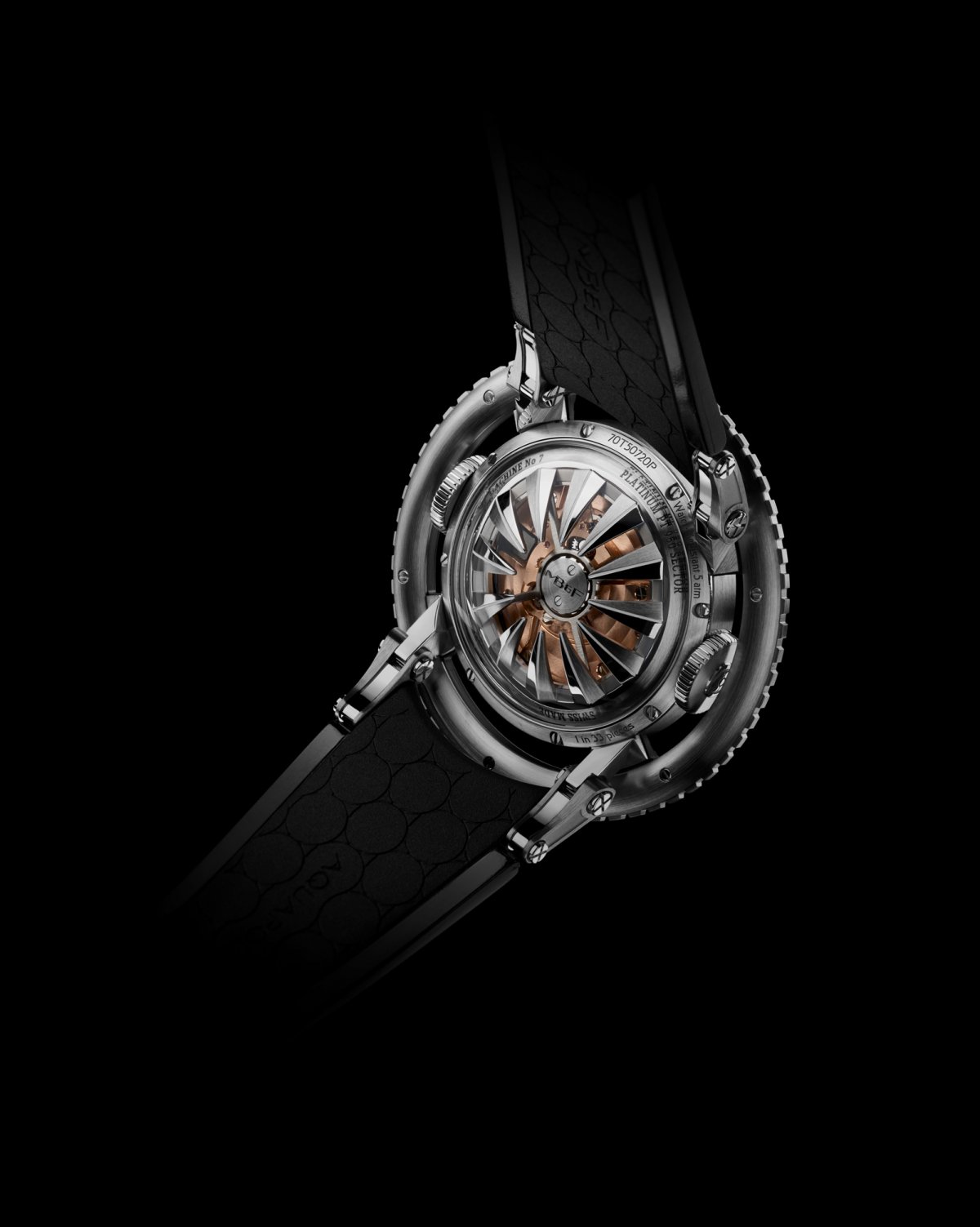自動盤的觸手以鈦金屬塊料鑄造。曲面設計3D立體的造型使加工程序成為一大挑戰,採用拋光與緞面方式交錯處理。在相對較輕的鈦金屬觸手的下方, 採用了較重的鉑金,確保 HM7 機芯能有效上鍊。