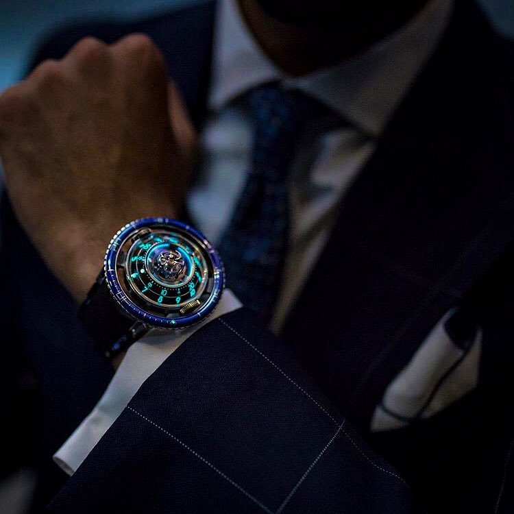 這只腕錶要詮釋的主題是水母。之前的HM6,品牌挑戰了仿生工業設計手法,此次更進一步,首度以生物為主題。結合過往累積的諸多技術,打造這具備中置陀飛輪的夜光水母。