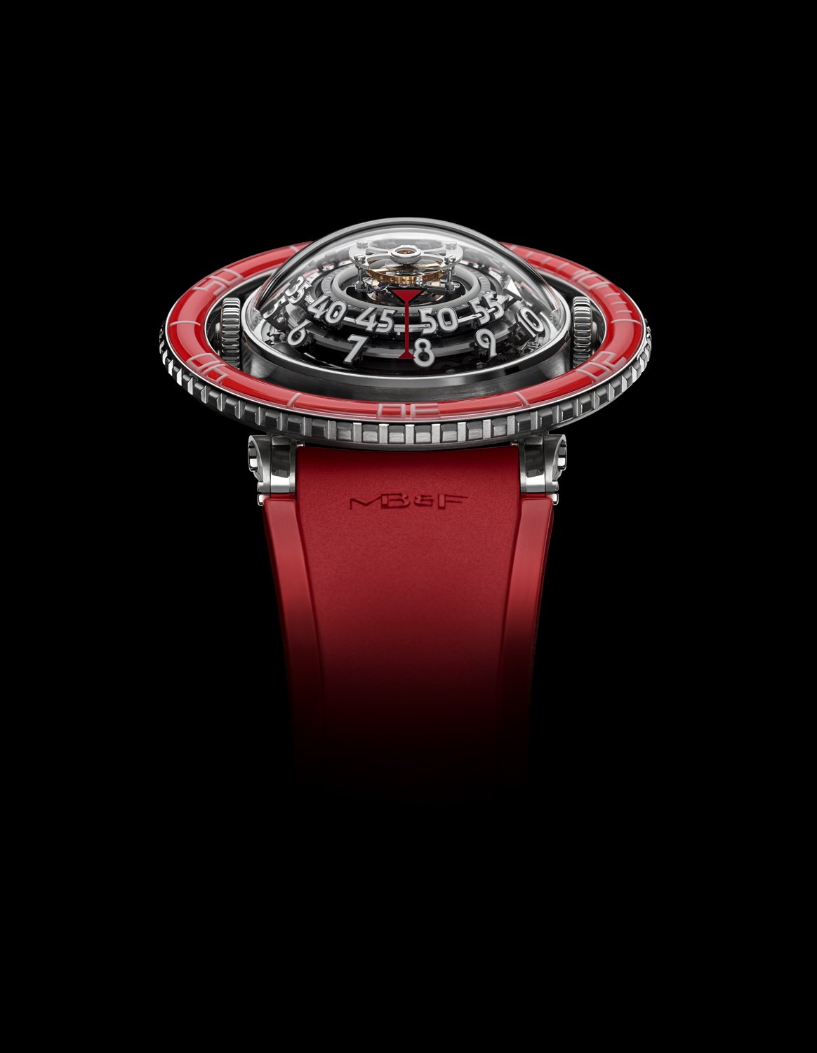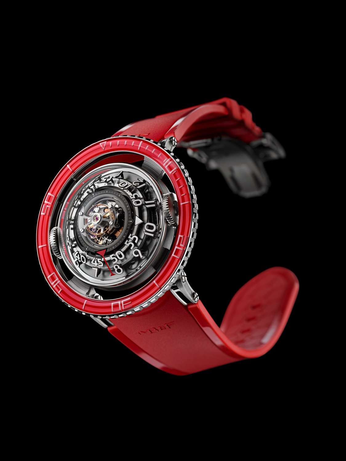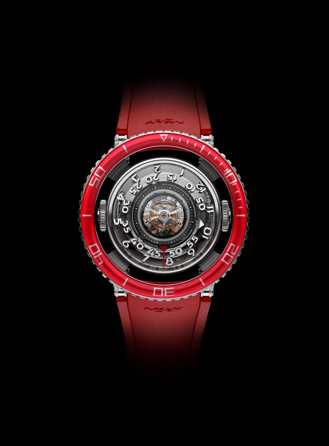 HM7 Aquapod 鉑金款紅色錶圈腕錶來自鐘錶大洋中的最深處,時標數字自由地漂浮,透視的形體則環繞著律動的心臟:60 秒飛行陀飛輪。