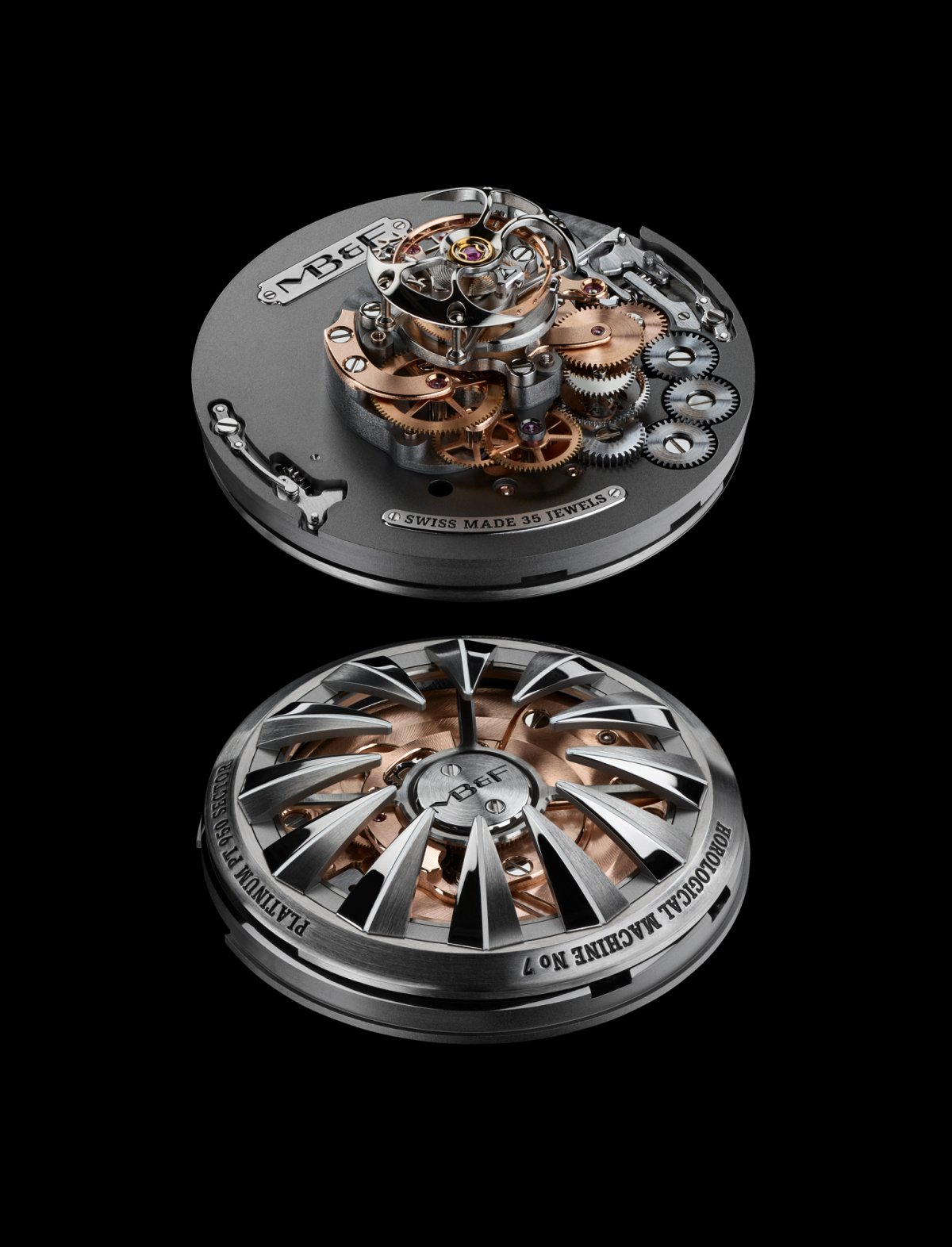 除了錶殼材質與紅色調之外,HM7 Aquapod在旋轉環材質上也略有不同,不像先前的HM7, 鉑金款的 3D 立體數字以鈦金屬雕刻而成,鈦金屬的輕量特質能有效降低機芯額外的負荷,然而這個機械設計上的優點卻有個代價,因為鈦的密度與硬度都極高,也就是說較難加工,製作難度比起前幾代Aquapod 的鋁製時間顯示環高出許多。此外,在「透明度」上HM7 鉑金款更做了改變,為了完美呈現水母通透的特色,MB&F將前幾代 Aquapod 的戰斧型陀飛輪橋板改用透明藍寶石零件,視覺效果更為震撼。