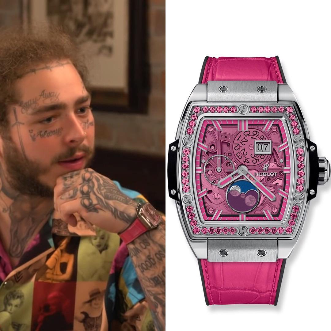 重量級Rapper Post Malone 配戴Hublot Spirit Of Big Bang Moonphase靈魂系列月相酒桶鈦金粉紅色