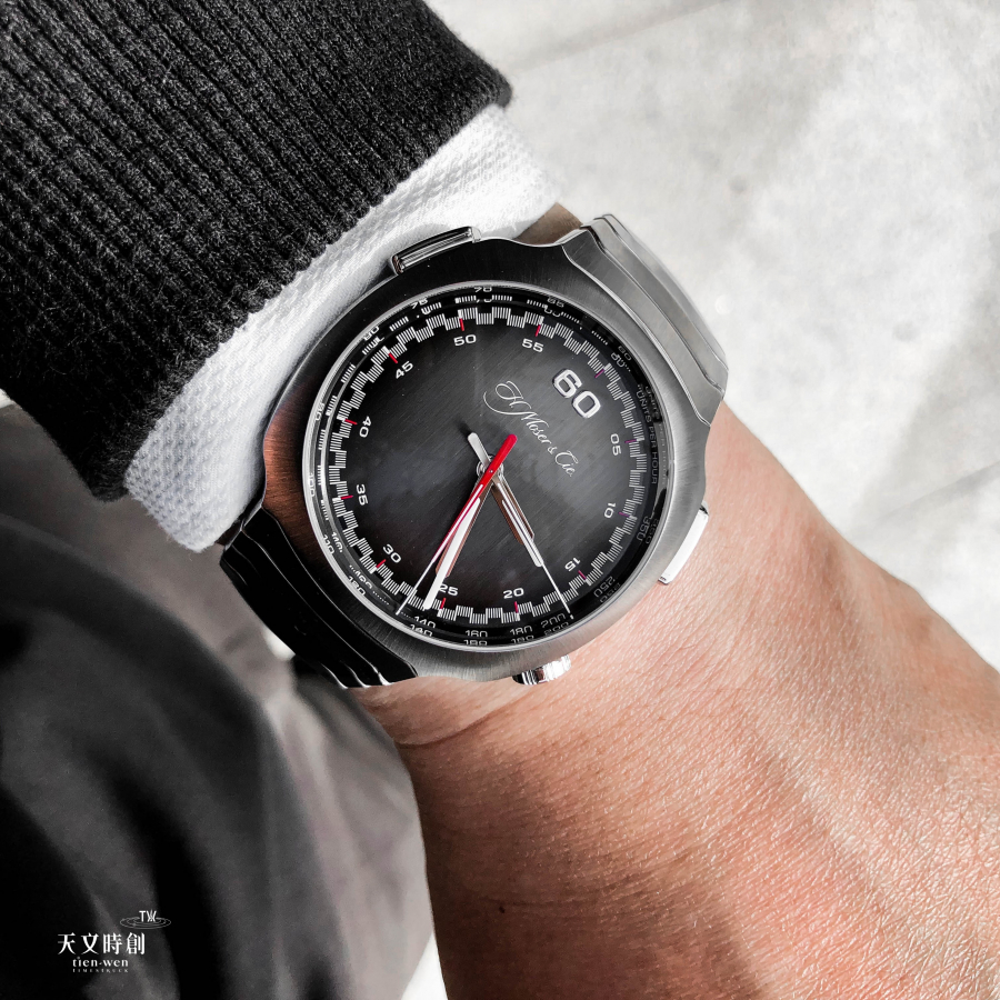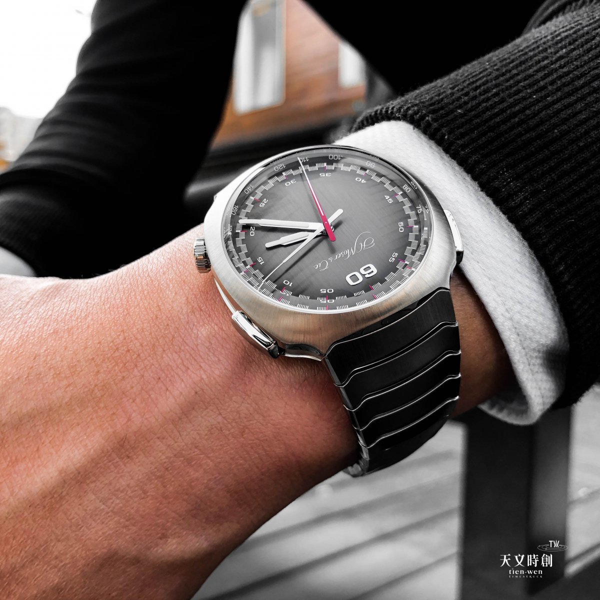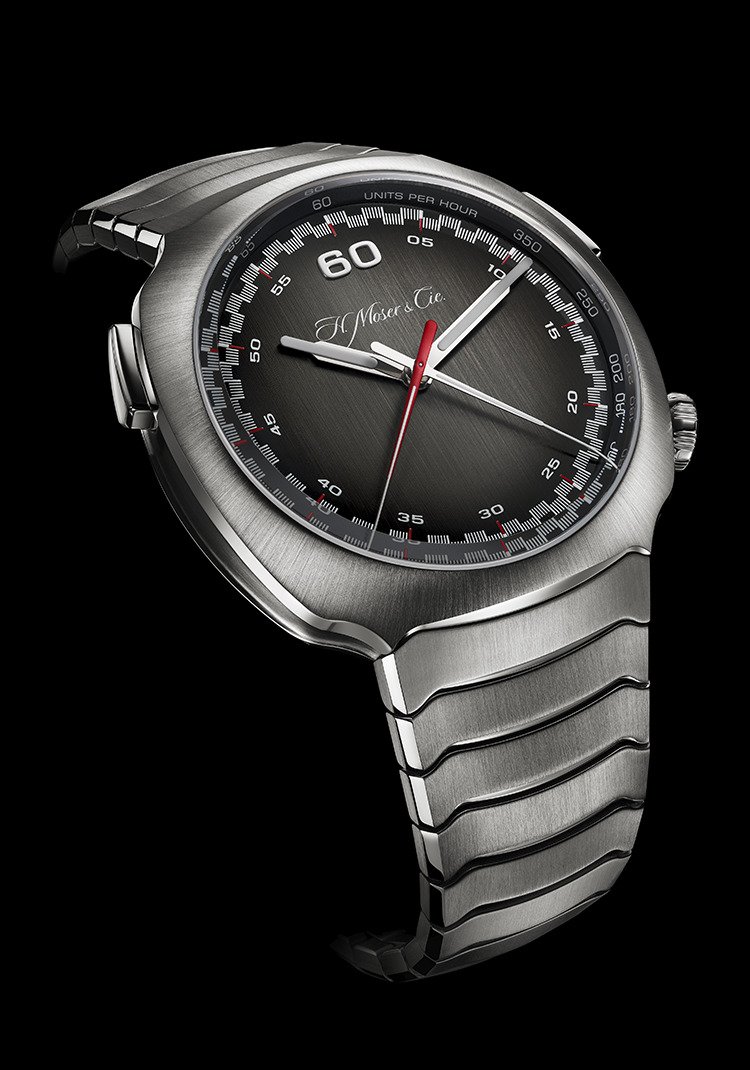 對於喜歡H. Moser & Cie.的錶迷,他們的錶在腦海裡總是有個既定的印象:簡約的錶盤、美麗的漸層煙燻色、精緻的做工、充滿優美線條的錶身弧度,而這只全新的「Streamliner」不僅是H.Moser的第一只鍊帶錶,而且是一只所有指針都同軸的飛返計時碼錶,一對計時按鈕做在錶款上側的2點鐘與10點鐘、錶冠在4點鐘位置,具備瞬跳功能的計時分針跳動乾淨利落,從外觀設計、錶盤佈局到機芯的選擇,都是一秉H.Moser簡約特色的運動錶。